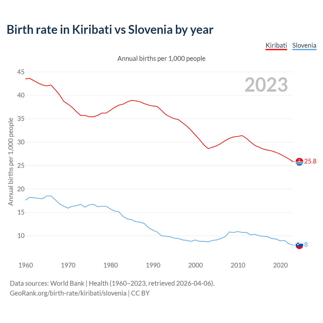 Kiribati has an annual birth rate of 25.8 births per 1,000 people, compared to 8 for Slovenia. The average number of children a woman is expected to have during her lifetime — the fertility rate, is 3.15 in Kiribati and 1.51 in Slovenia — 52% difference.