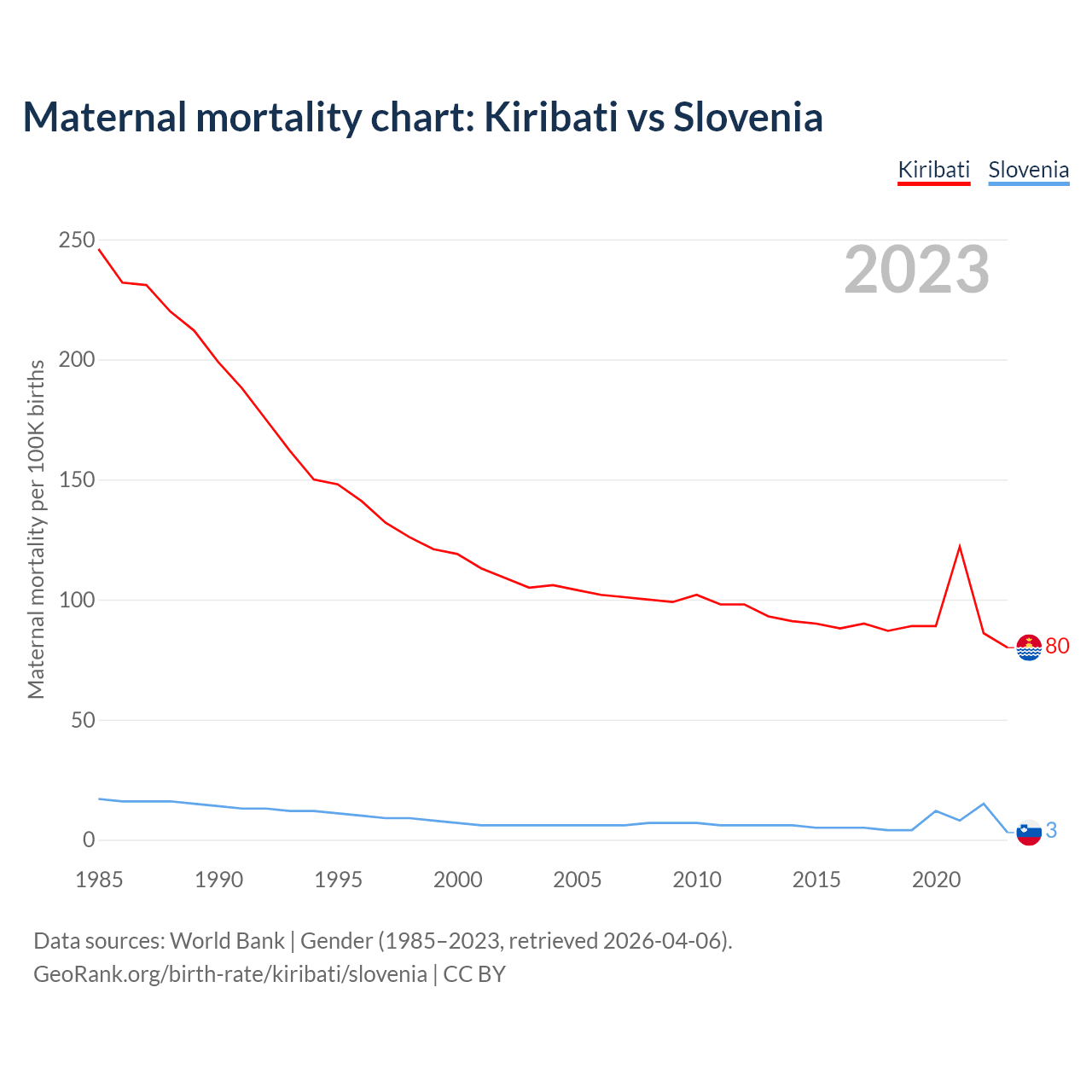 The maternal mortality rate, which is the probability of dying during childbirth or within 42 days of pregnancy termination, is 80 deaths per 100,000 live births in Kiribati, compared to 3 deaths in Slovenia.