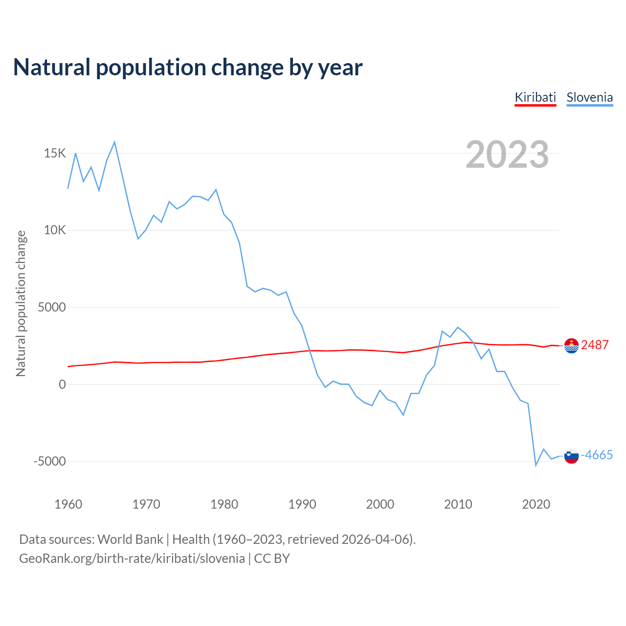 According to the latest available data on birth rates, the fertility rate in Kiribati was 3.15 children per woman in 2023, compared to 1.51 in Slovenia in 2023. The replacement level is considered to be 2.1 children per woman.