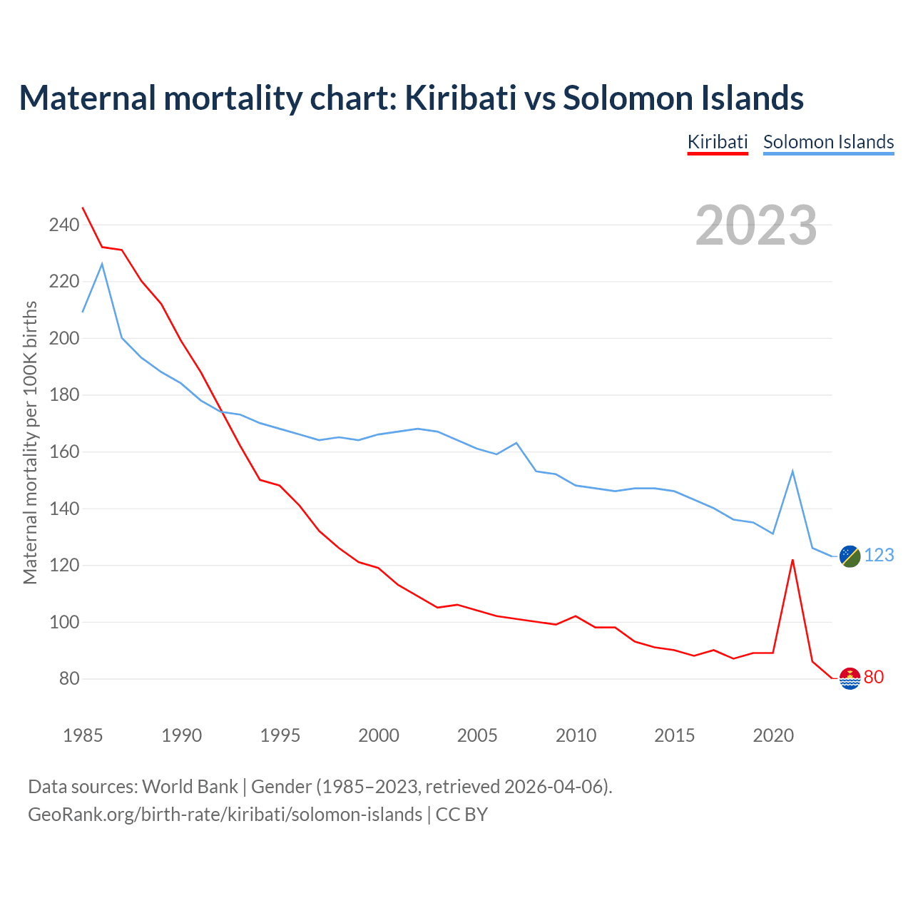 The maternal mortality rate, which is the probability of dying during childbirth or within 42 days of pregnancy termination, is 80 deaths per 100,000 live births in Kiribati, compared to 123 deaths in the Solomon Islands.