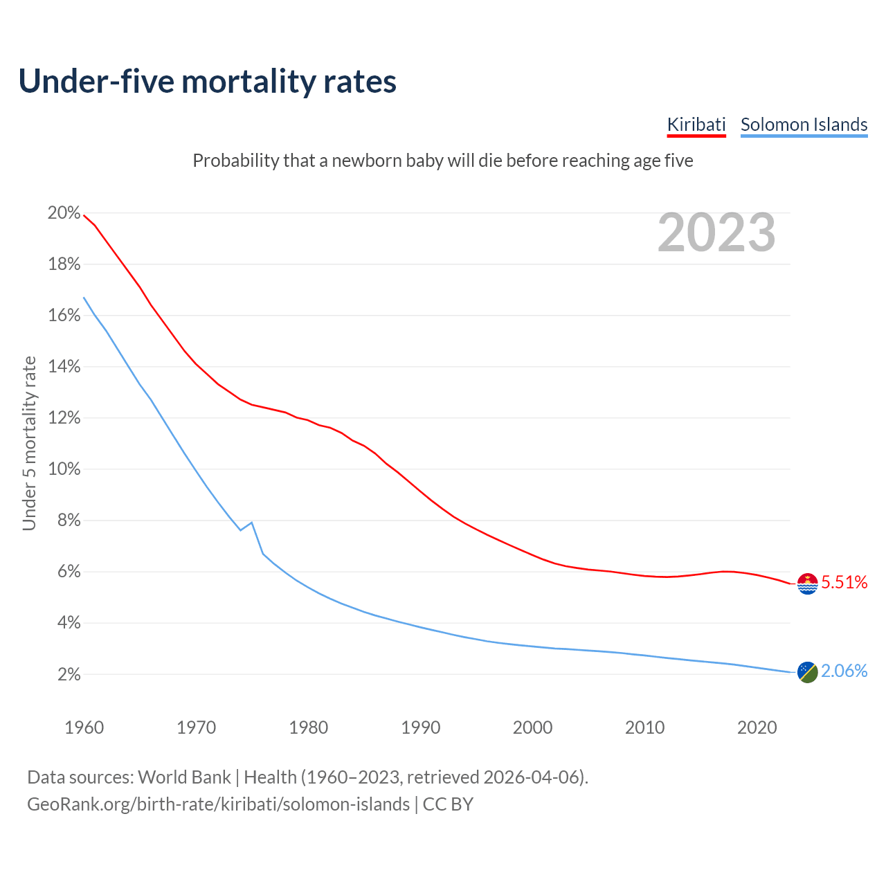 The chance that a newborn baby will die before reaching age five is 5.51% in Kiribati and 2.06% in the Solomon Islands. Above is a chart with historical data on under-five mortality rates.