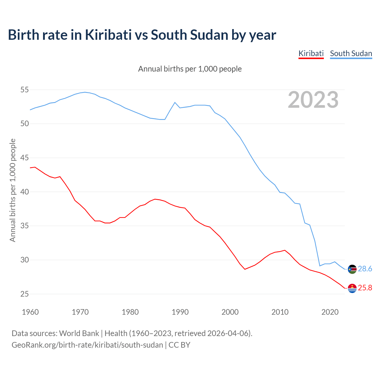 Kiribati has an annual birth rate of 25.8 births per 1,000 people, compared to 28.6 for South Sudan. The average number of children a woman is expected to have during her lifetime — the fertility rate, is 3.15 in Kiribati and 3.86 in South Sudan — 22.8% difference.