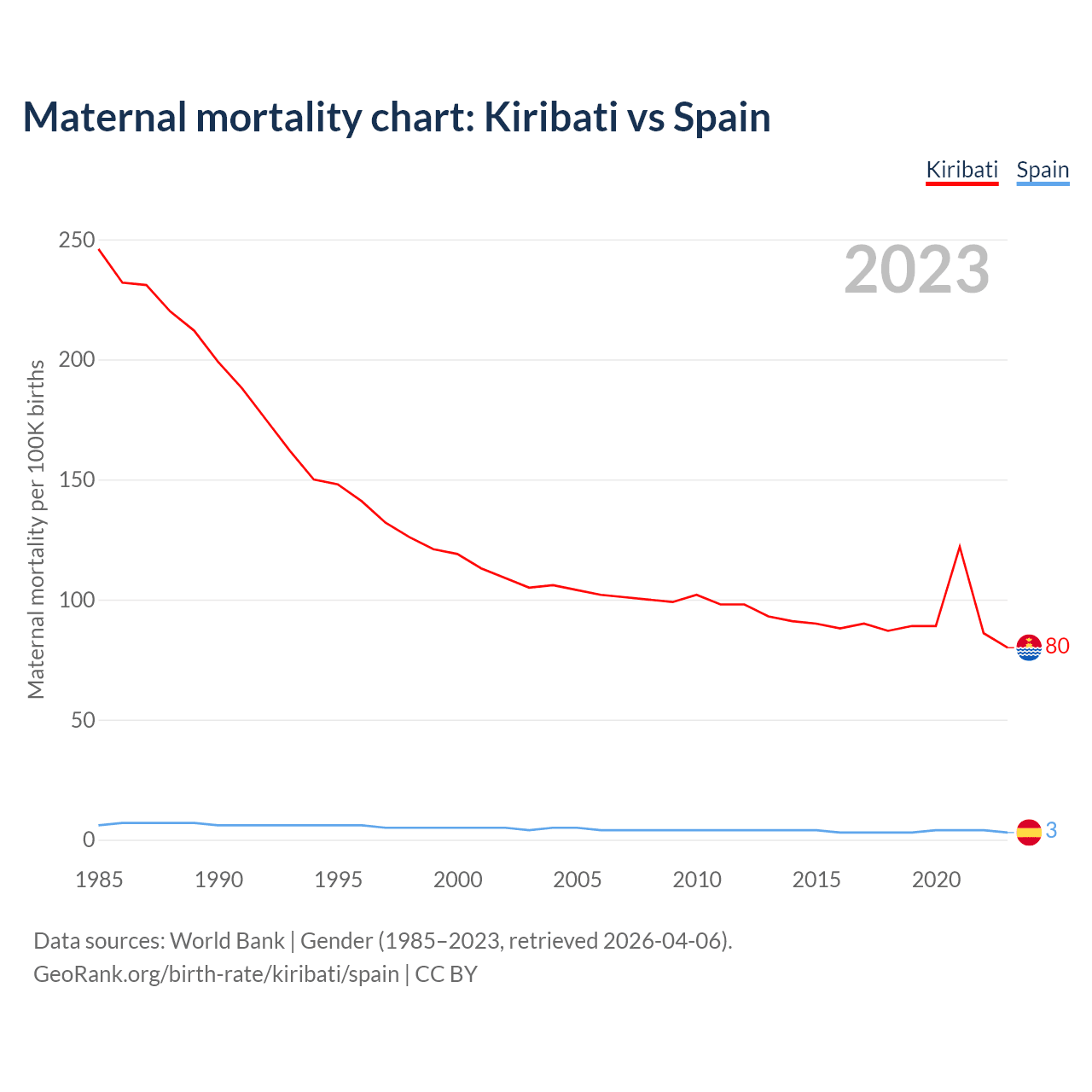 The maternal mortality rate, which is the probability of dying during childbirth or within 42 days of pregnancy termination, is 80 deaths per 100,000 live births in Kiribati, compared to 3 deaths in Spain.