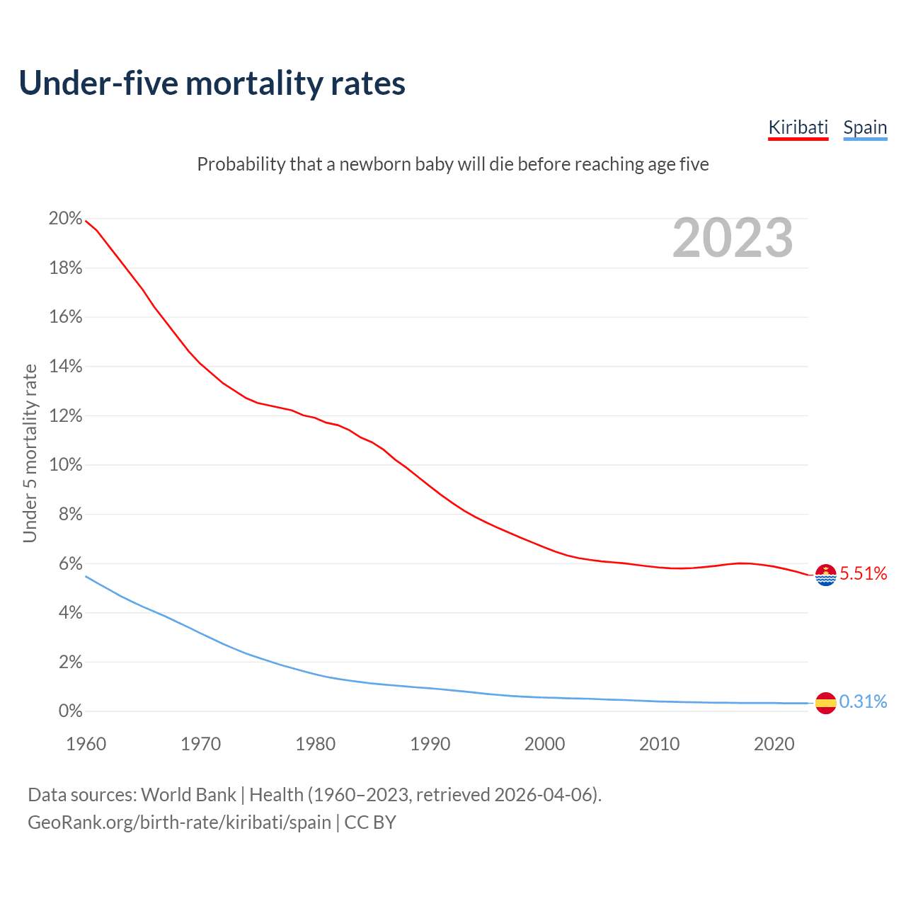 The chance that a newborn baby will die before reaching age five is 5.51% in Kiribati and 0.31% in Spain. Above is a chart with historical data on under-five mortality rates.