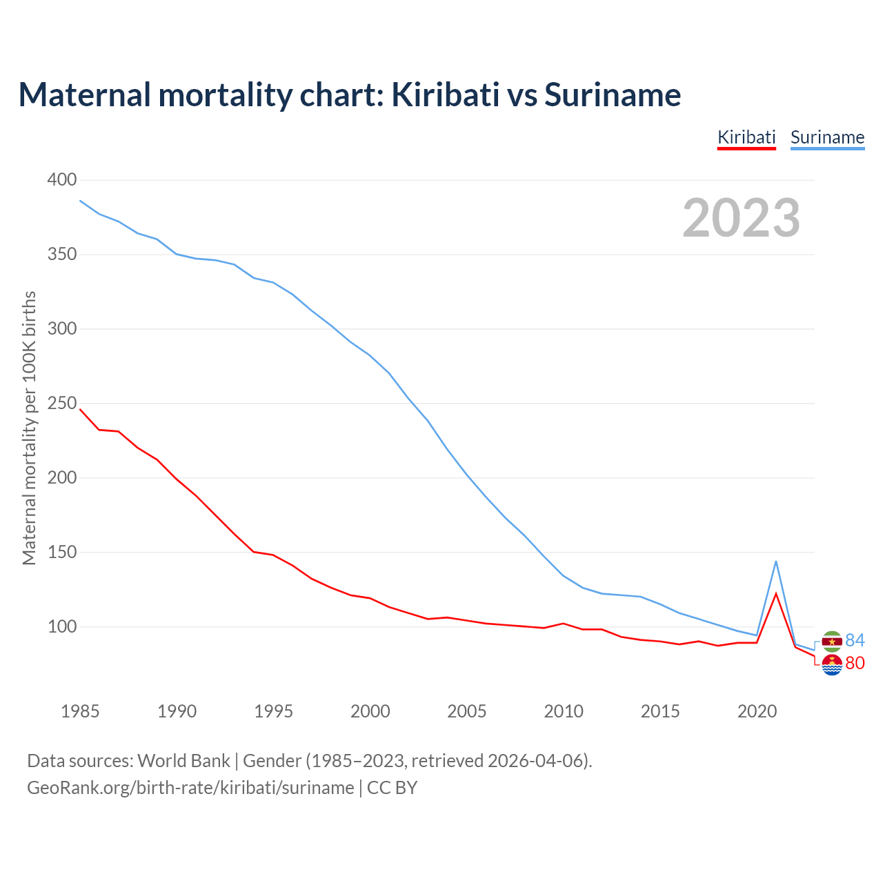 The maternal mortality rate, which is the probability of dying during childbirth or within 42 days of pregnancy termination, is 80 deaths per 100,000 live births in Kiribati, compared to 84 deaths in Suriname.