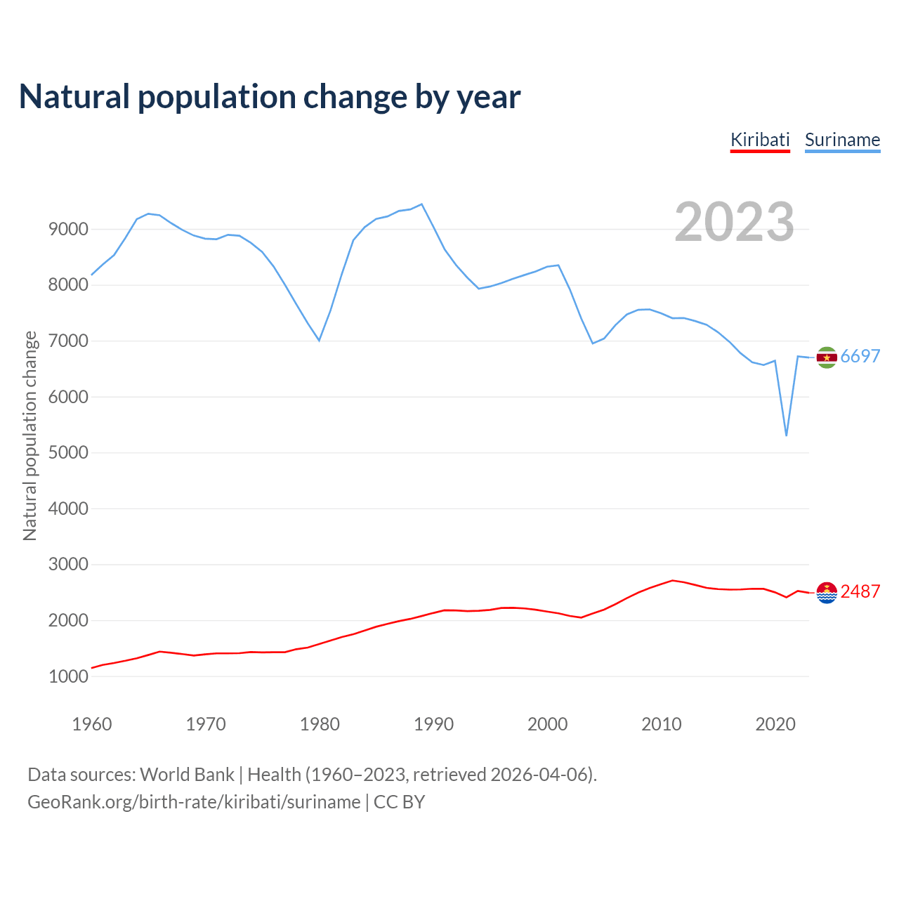According to the latest available data on birth rates, the fertility rate in Kiribati was 3.15 children per woman in 2023, compared to 2.25 in Suriname in 2023. The replacement level is considered to be 2.1 children per woman.