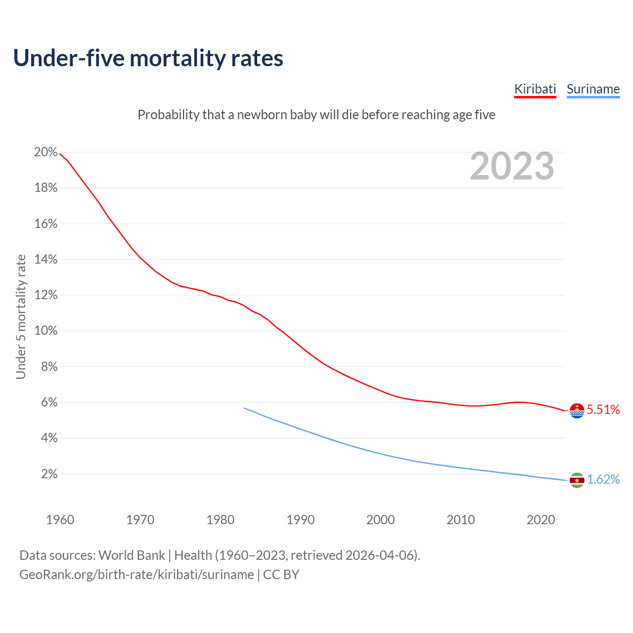 The chance that a newborn baby will die before reaching age five is 5.51% in Kiribati and 1.62% in Suriname. Above is a chart with historical data on under-five mortality rates.