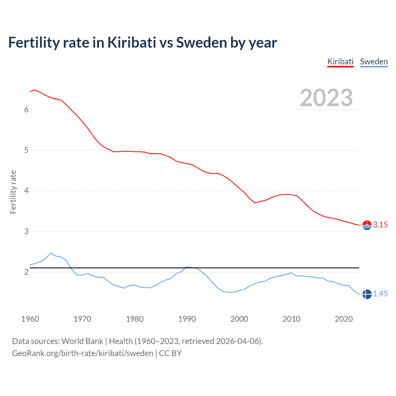 1960 vs 2023, the fertility rate has decreased by 51.1% in Kiribati and by 33.2% in Sweden — in 1960, it was 6.44 and 2.17, respectively.
