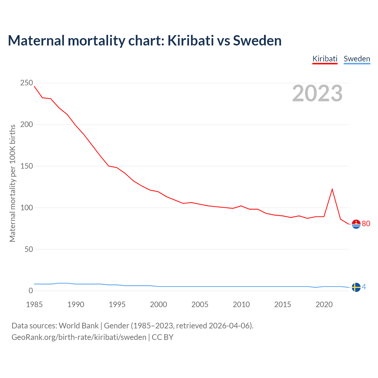 The maternal mortality rate, which is the probability of dying during childbirth or within 42 days of pregnancy termination, is 80 deaths per 100,000 live births in Kiribati, compared to 4 deaths in Sweden.