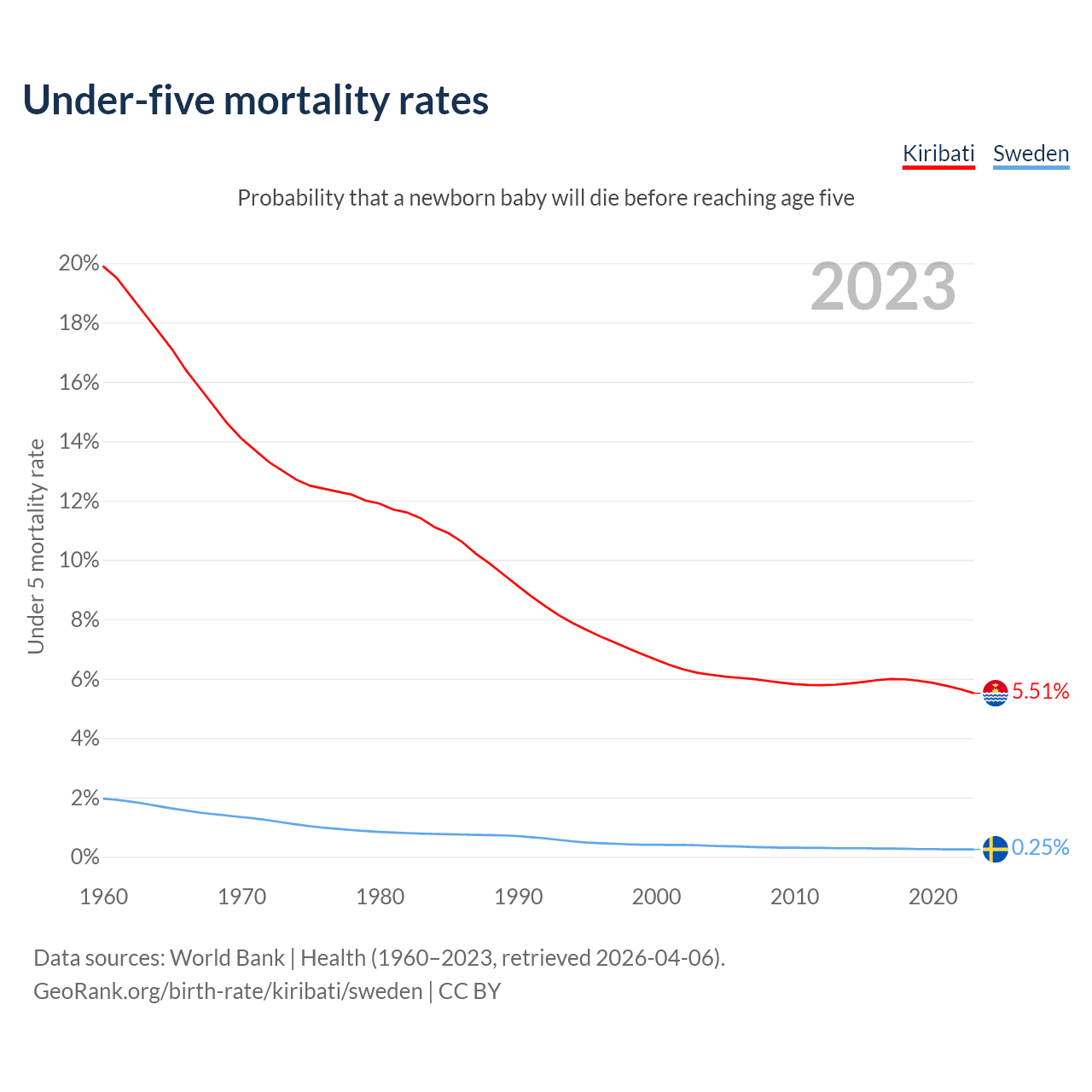 The chance that a newborn baby will die before reaching age five is 5.51% in Kiribati and 0.25% in Sweden. Above is a chart with historical data on under-five mortality rates.