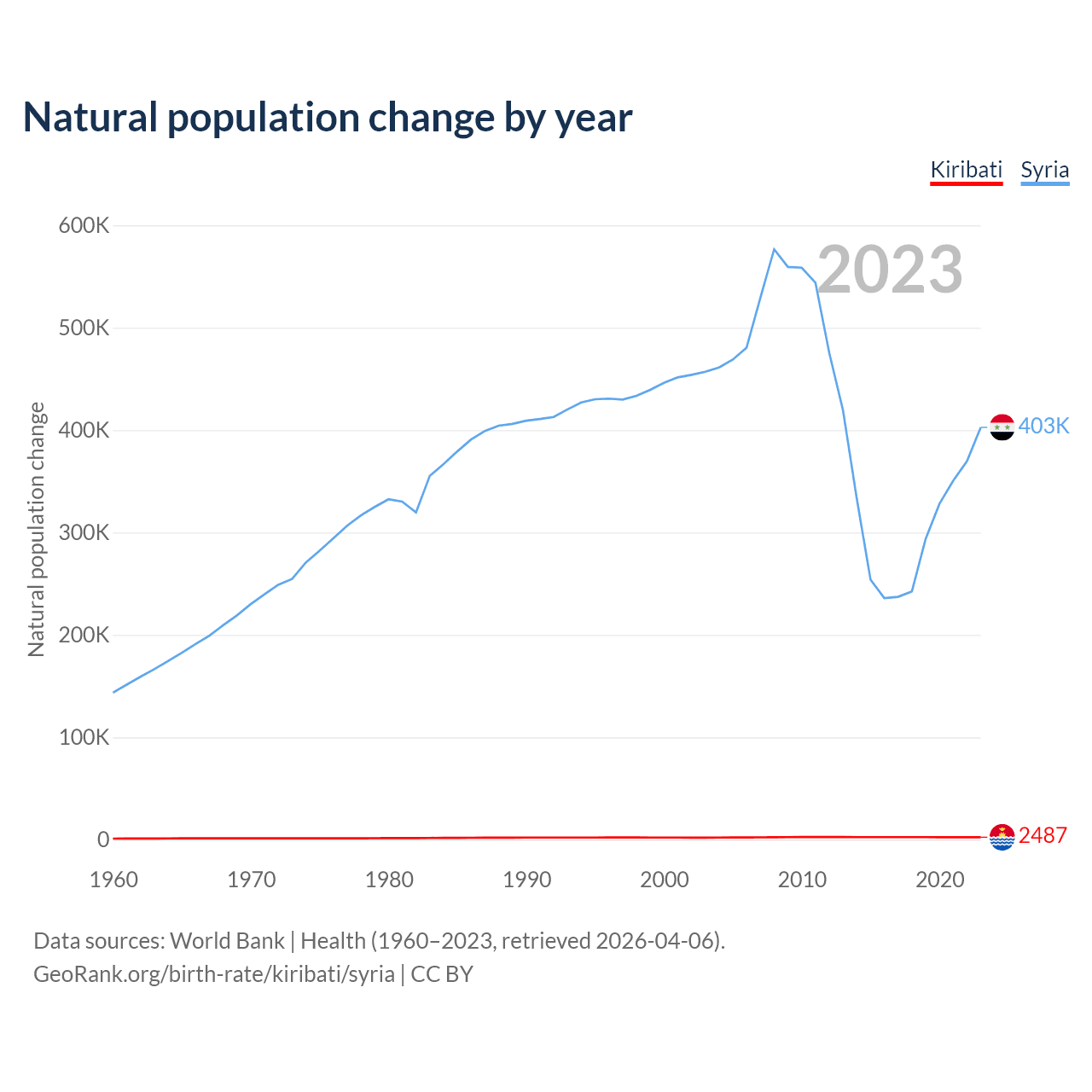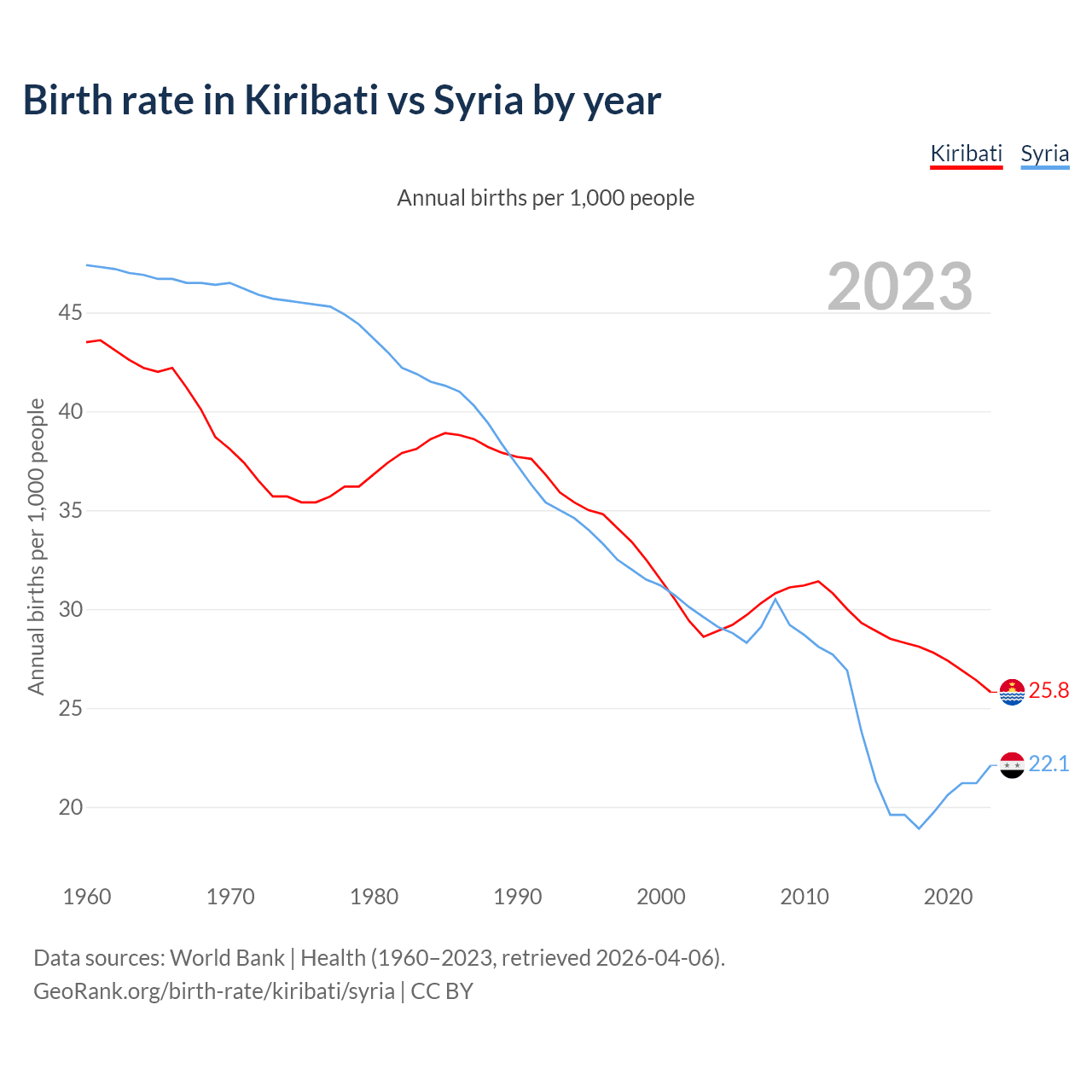 Kiribati has an annual birth rate of 25.8 births per 1,000 people, compared to 22.1 for Syria. The average number of children a woman is expected to have during her lifetime — the fertility rate, is 3.15 in Kiribati and 2.71 in Syria — 13.8% difference.