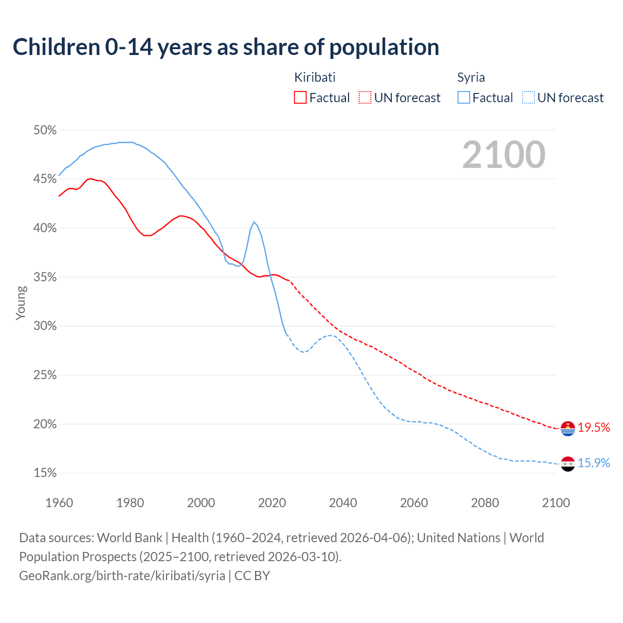According to the latest available data on birth rates, the fertility rate in Kiribati was 3.15 children per woman in 2023, compared to 2.71 in Syria in 2023. The replacement level is considered to be 2.1 children per woman.