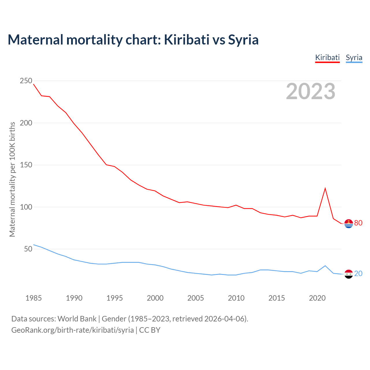 The maternal mortality rate, which is the probability of dying during childbirth or within 42 days of pregnancy termination, is 80 deaths per 100,000 live births in Kiribati, compared to 20 deaths in Syria.