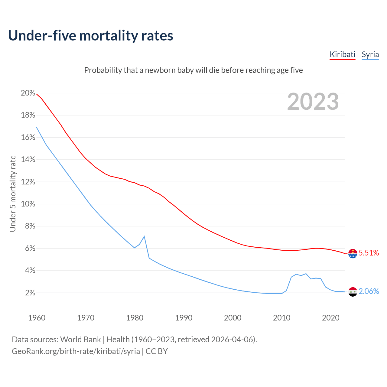 The chance that a newborn baby will die before reaching age five is 5.51% in Kiribati and 2.06% in Syria. Above is a chart with historical data on under-five mortality rates.