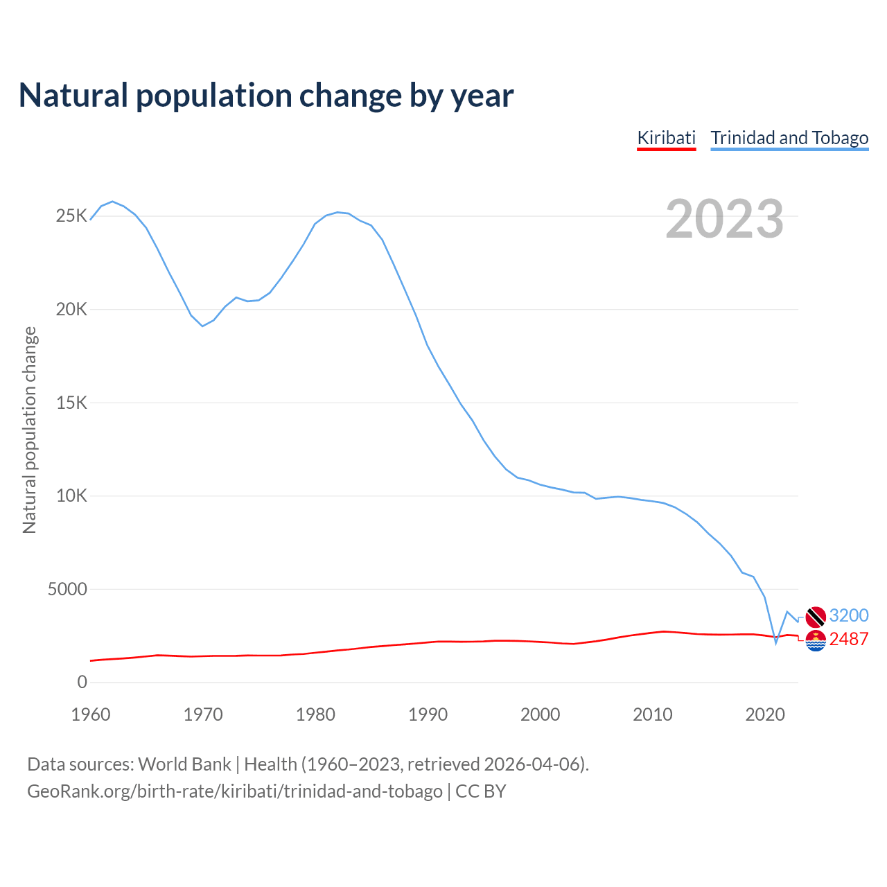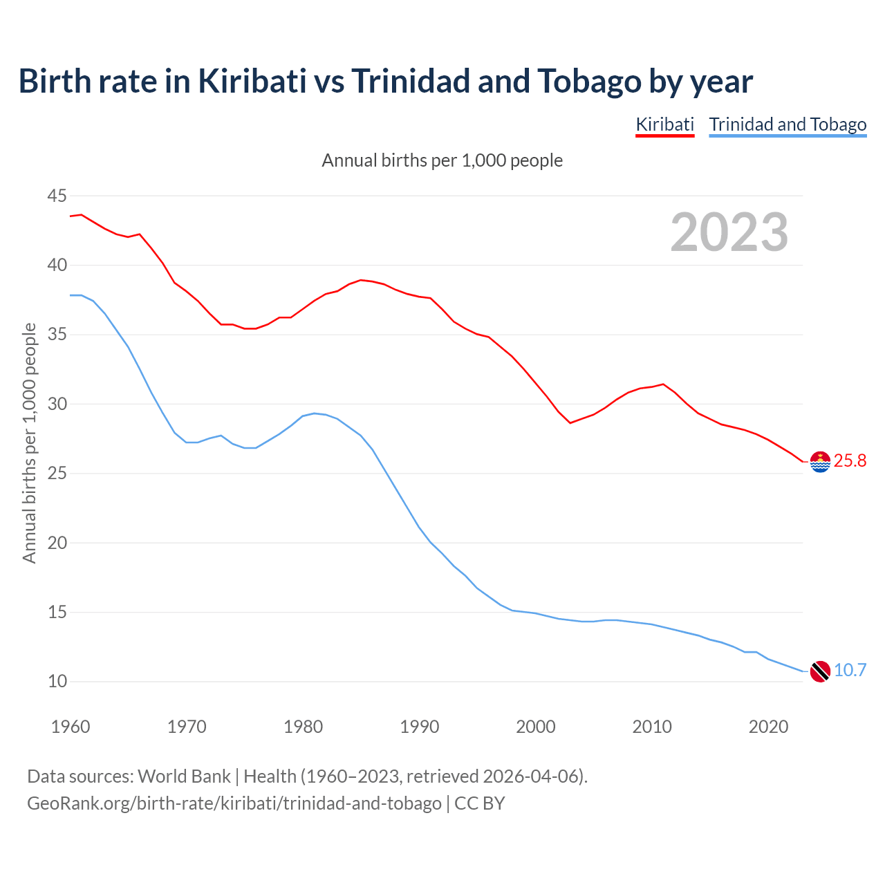 Kiribati has an annual birth rate of 25.8 births per 1,000 people, compared to 10.7 for Trinidad and Tobago. The average number of children a woman is expected to have during her lifetime — the fertility rate, is 3.15 in Kiribati and 1.53 in Trinidad and Tobago — 51.3% difference.