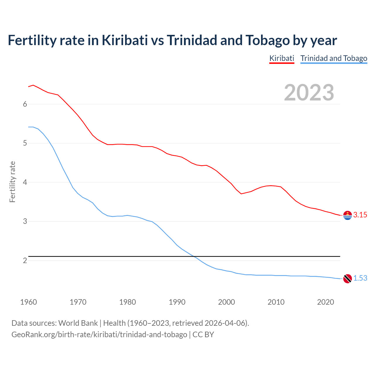 According to the latest available data on birth rates, the fertility rate in Kiribati was 3.15 children per woman in 2023, compared to 1.53 in Trinidad and Tobago in 2023. The replacement level is considered to be 2.1 children per woman.