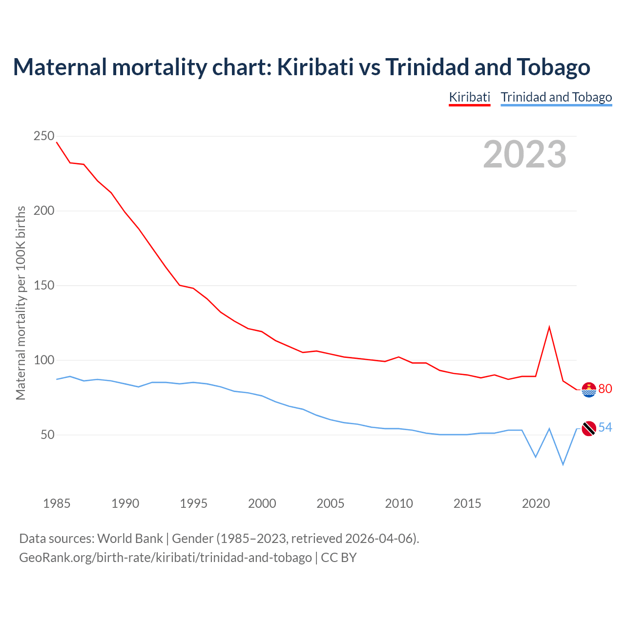 The maternal mortality rate, which is the probability of dying during childbirth or within 42 days of pregnancy termination, is 80 deaths per 100,000 live births in Kiribati, compared to 54 deaths in Trinidad and Tobago.