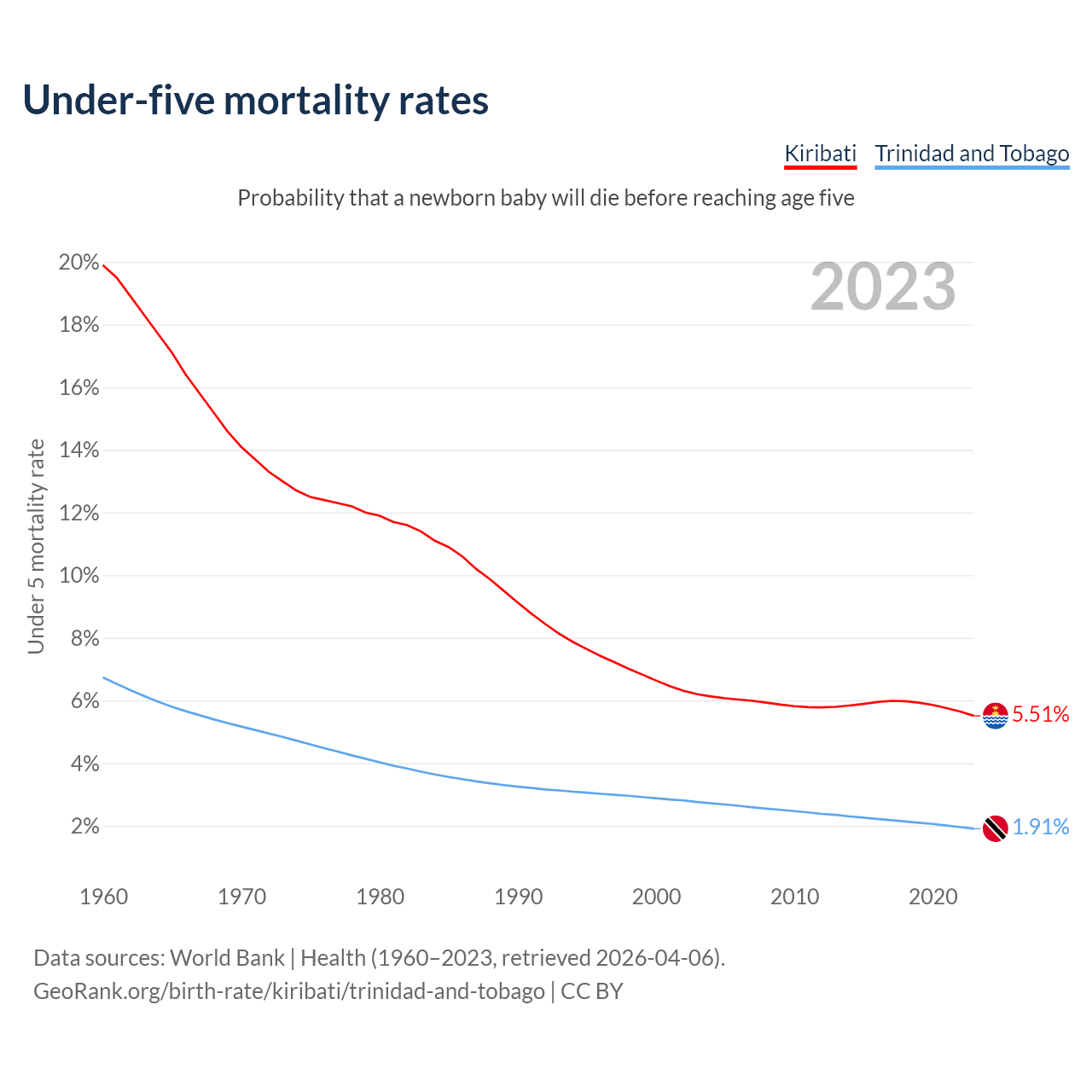 The chance that a newborn baby will die before reaching age five is 5.51% in Kiribati and 1.91% in Trinidad and Tobago. Above is a chart with historical data on under-five mortality rates.