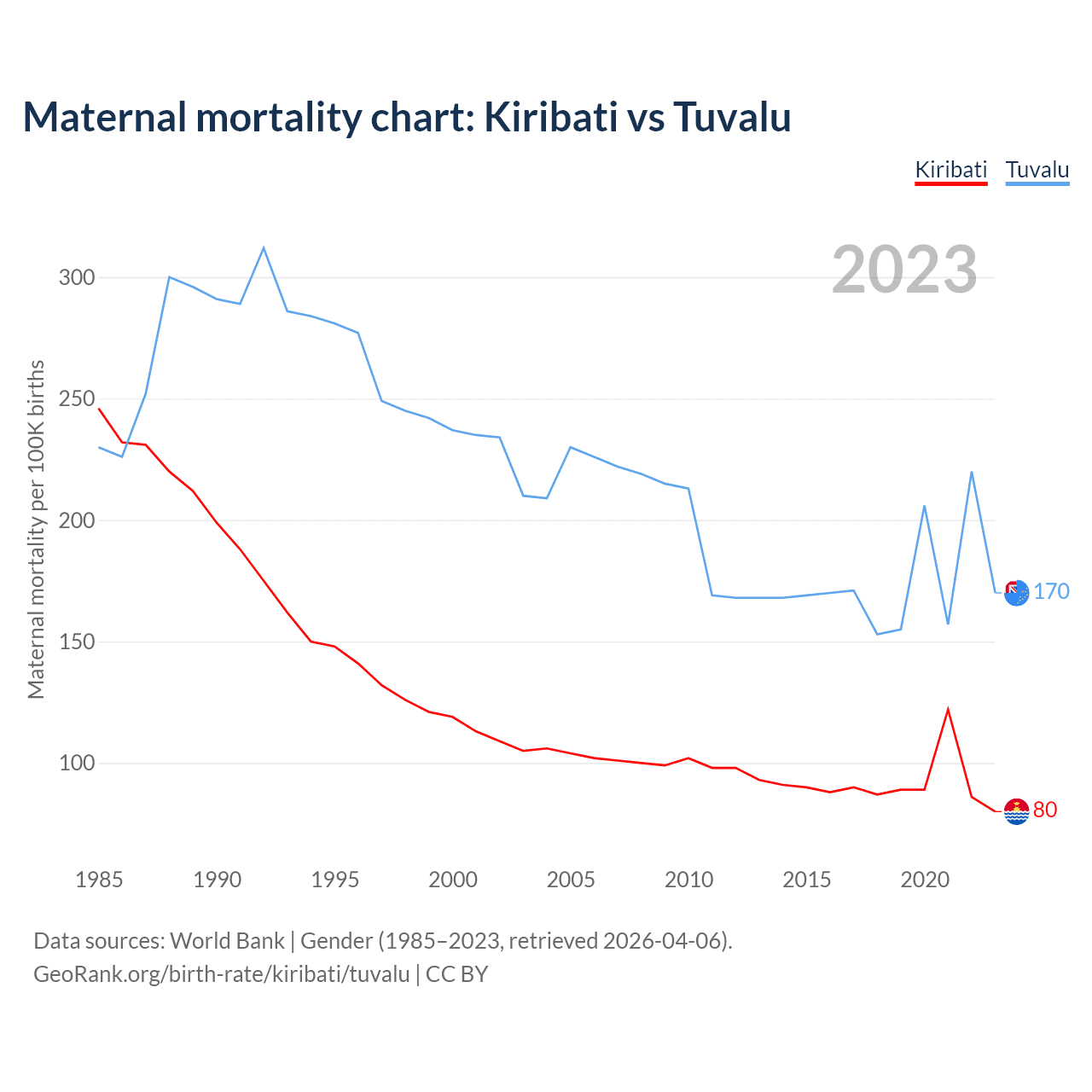 The maternal mortality rate, which is the probability of dying during childbirth or within 42 days of pregnancy termination, is 80 deaths per 100,000 live births in Kiribati, compared to 170 deaths in Tuvalu.