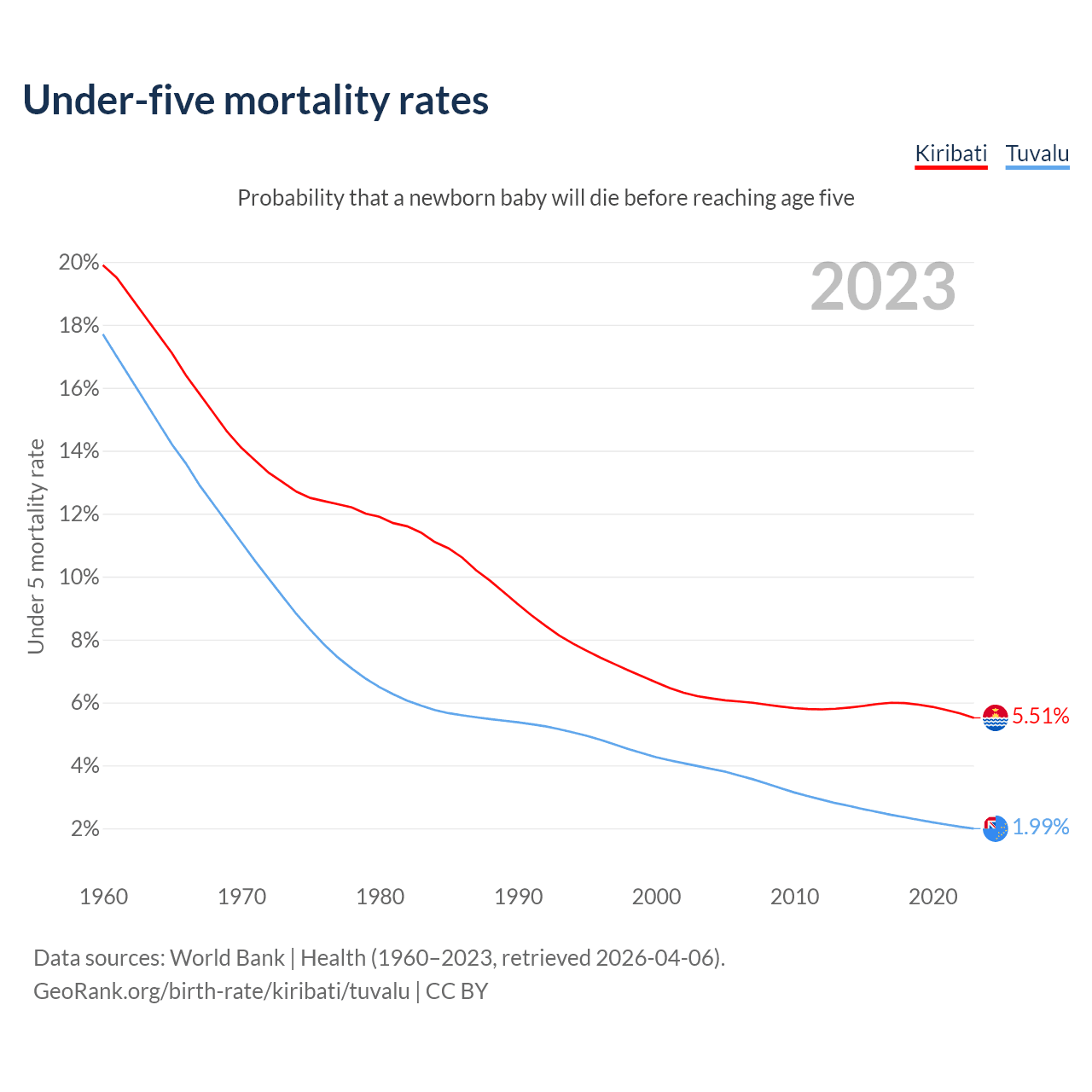 The chance that a newborn baby will die before reaching age five is 5.51% in Kiribati and 1.99% in Tuvalu. Above is a chart with historical data on under-five mortality rates.