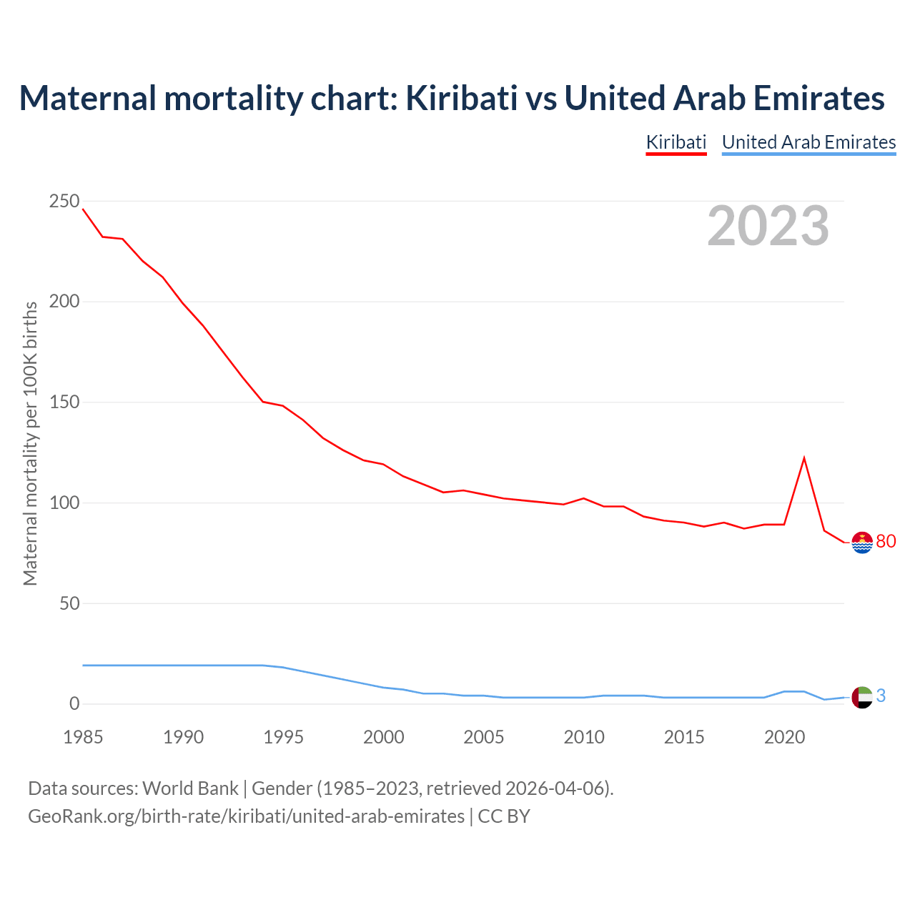 The maternal mortality rate, which is the probability of dying during childbirth or within 42 days of pregnancy termination, is 80 deaths per 100,000 live births in Kiribati, compared to 3 deaths in the United Arab Emirates.