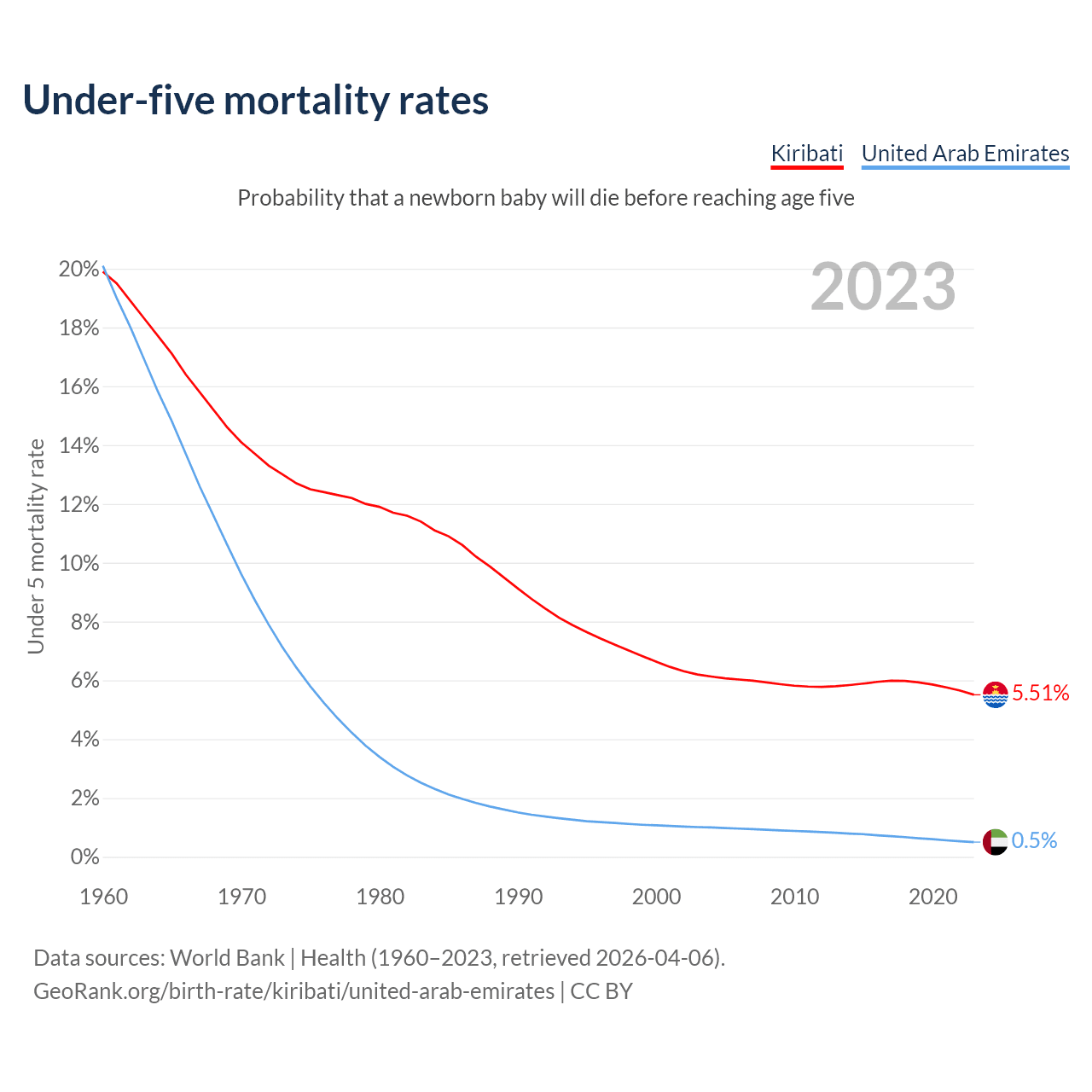 The chance that a newborn baby will die before reaching age five is 5.51% in Kiribati and 0.5% in the United Arab Emirates. Above is a chart with historical data on under-five mortality rates.