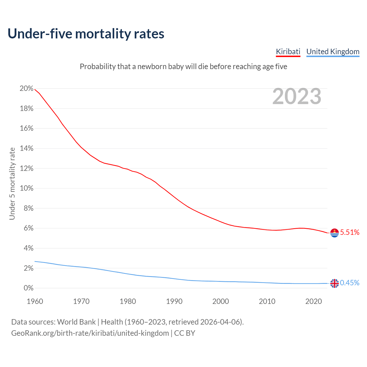 The chance that a newborn baby will die before reaching age five is 5.51% in Kiribati and 0.45% in the United Kingdom. Above is a chart with historical data on under-five mortality rates.