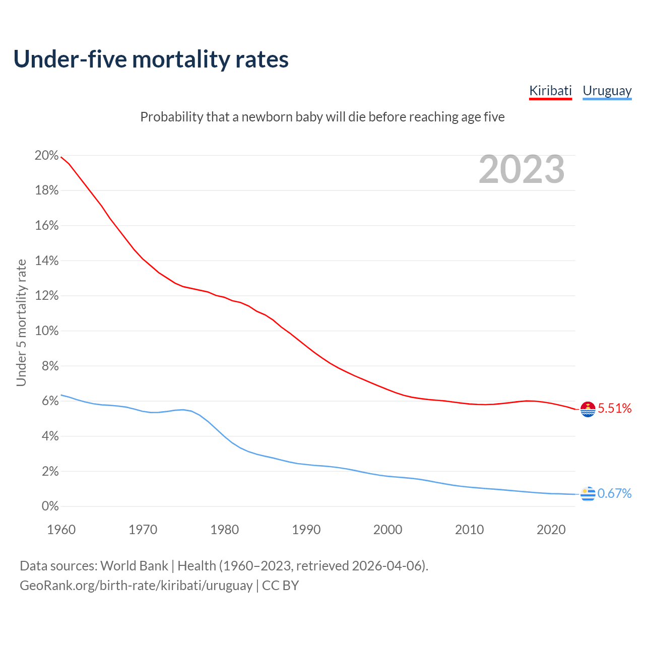 The chance that a newborn baby will die before reaching age five is 5.51% in Kiribati and 0.67% in Uruguay. Above is a chart with historical data on under-five mortality rates.