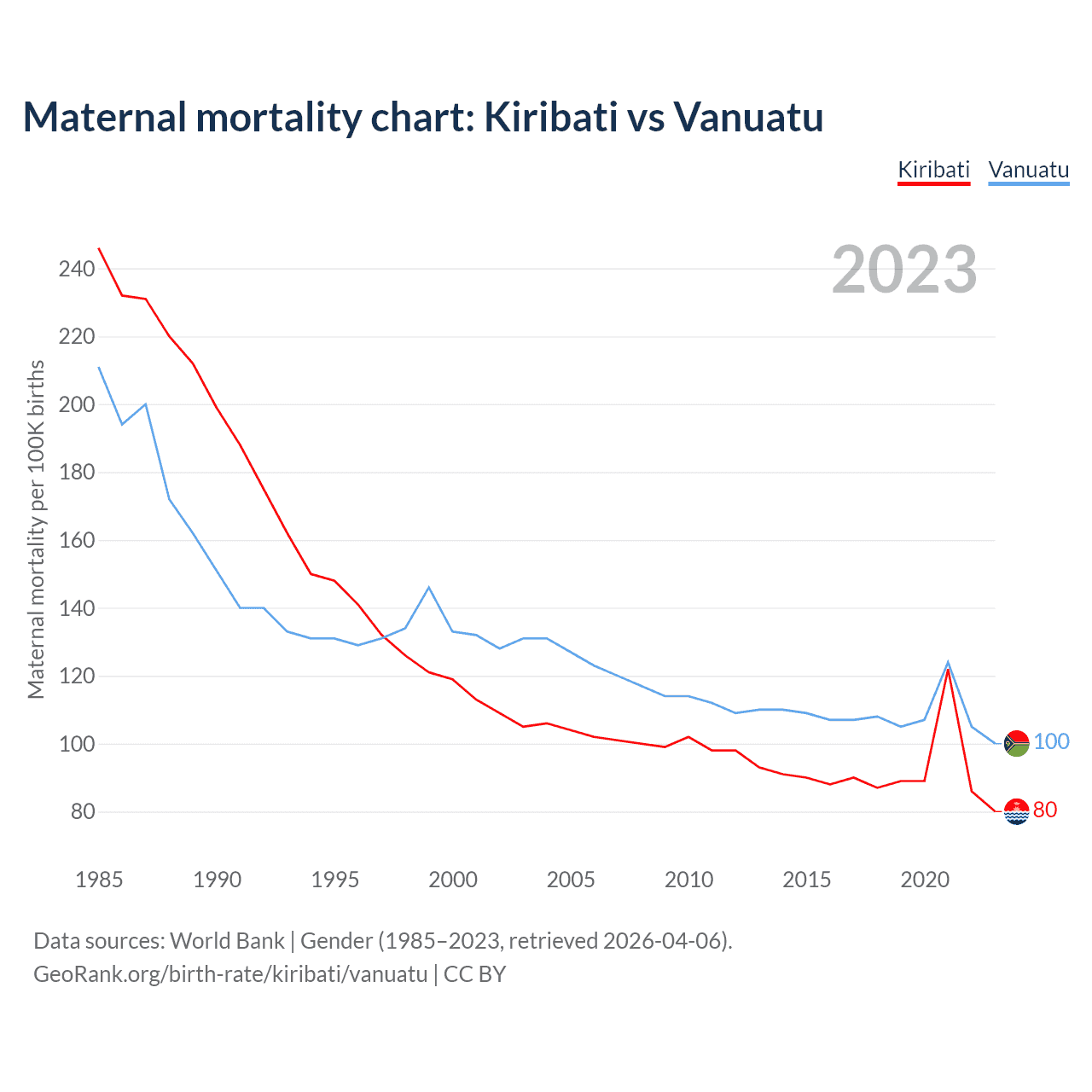 The maternal mortality rate, which is the probability of dying during childbirth or within 42 days of pregnancy termination, is 80 deaths per 100,000 live births in Kiribati, compared to 100 deaths in Vanuatu.