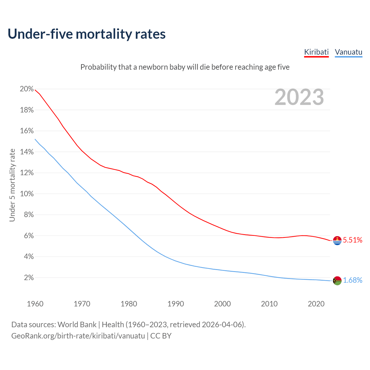 The chance that a newborn baby will die before reaching age five is 5.51% in Kiribati and 1.68% in Vanuatu. Above is a chart with historical data on under-five mortality rates.