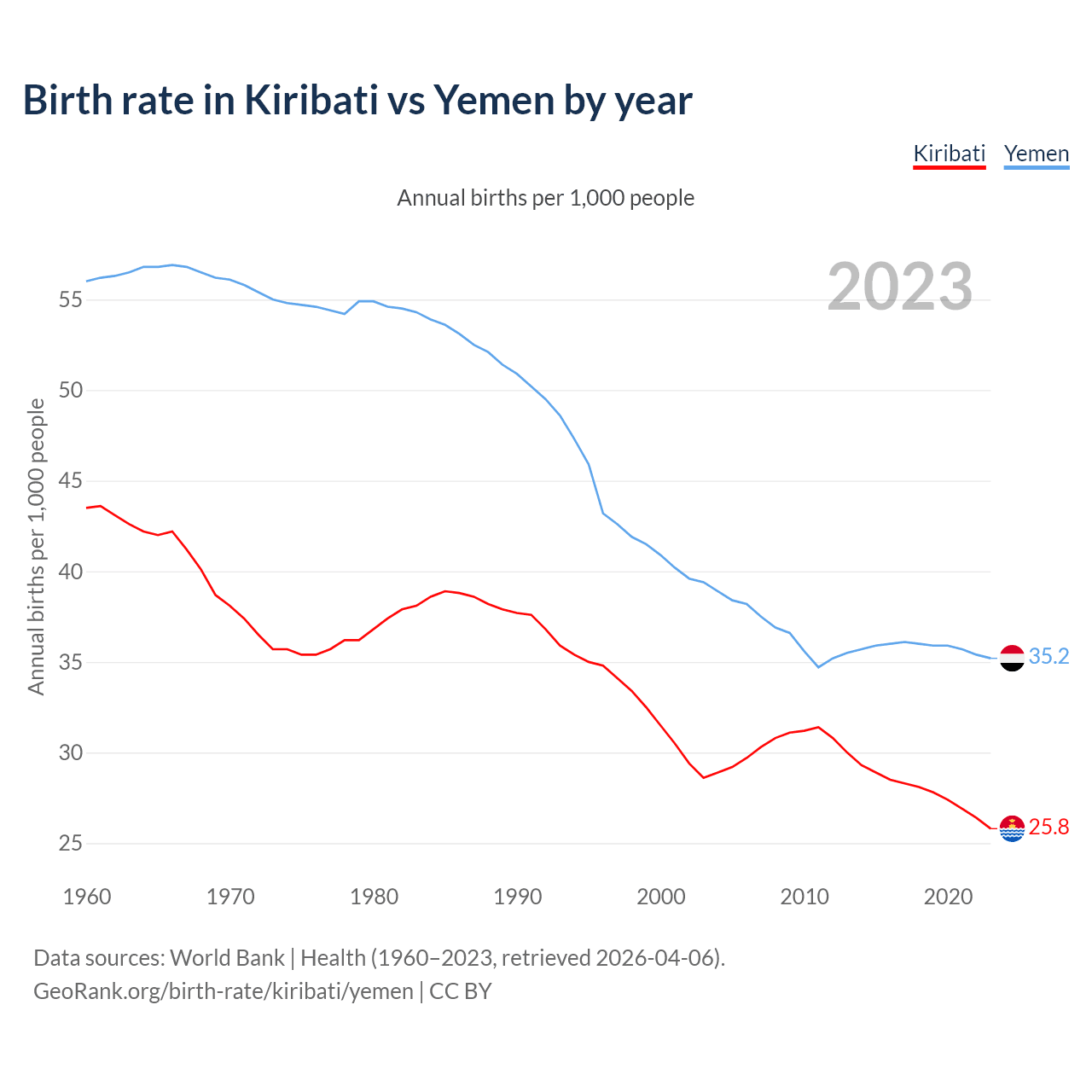 Kiribati has an annual birth rate of 25.8 births per 1,000 people, compared to 35.2 for Yemen. The average number of children a woman is expected to have during her lifetime — the fertility rate, is 3.15 in Kiribati and 4.59 in Yemen — 45.9% difference.