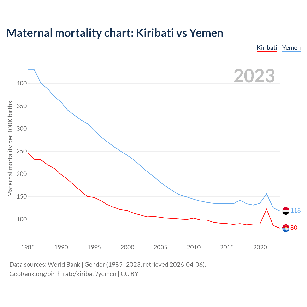 The maternal mortality rate, which is the probability of dying during childbirth or within 42 days of pregnancy termination, is 80 deaths per 100,000 live births in Kiribati, compared to 118 deaths in Yemen.