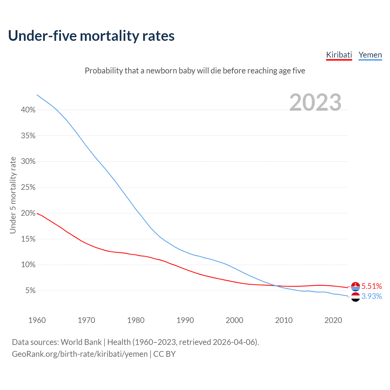 The chance that a newborn baby will die before reaching age five is 5.51% in Kiribati and 3.93% in Yemen. Above is a chart with historical data on under-five mortality rates.
