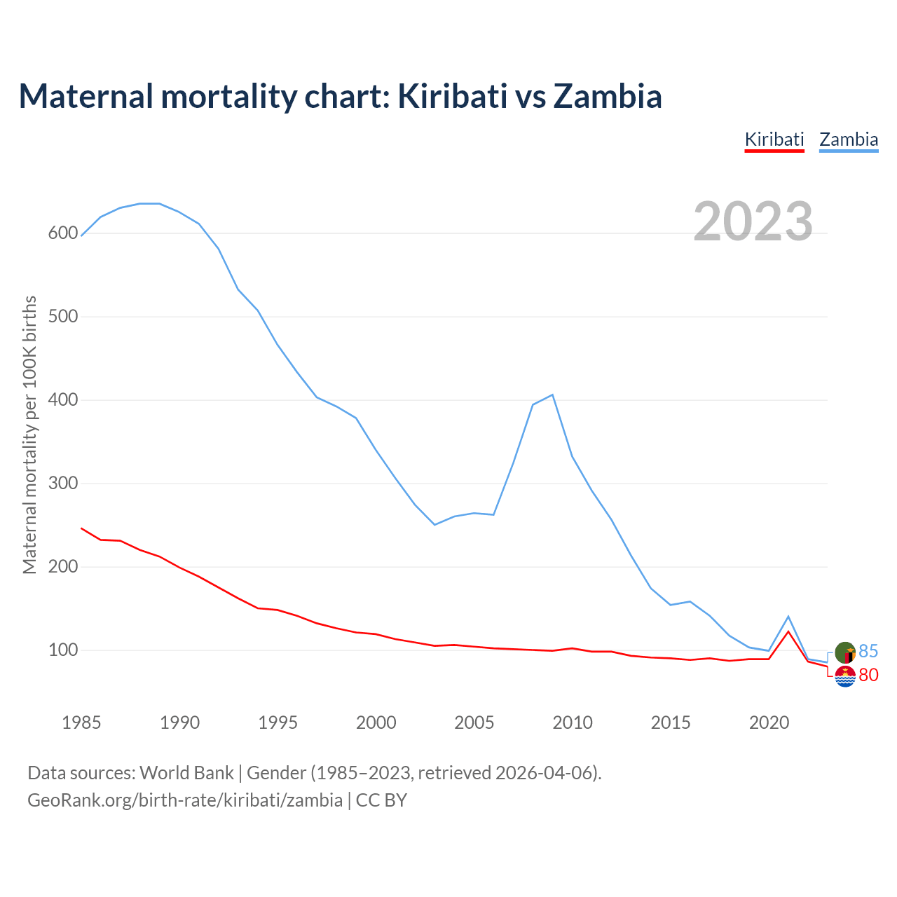 The maternal mortality rate, which is the probability of dying during childbirth or within 42 days of pregnancy termination, is 80 deaths per 100,000 live births in Kiribati, compared to 85 deaths in Zambia.