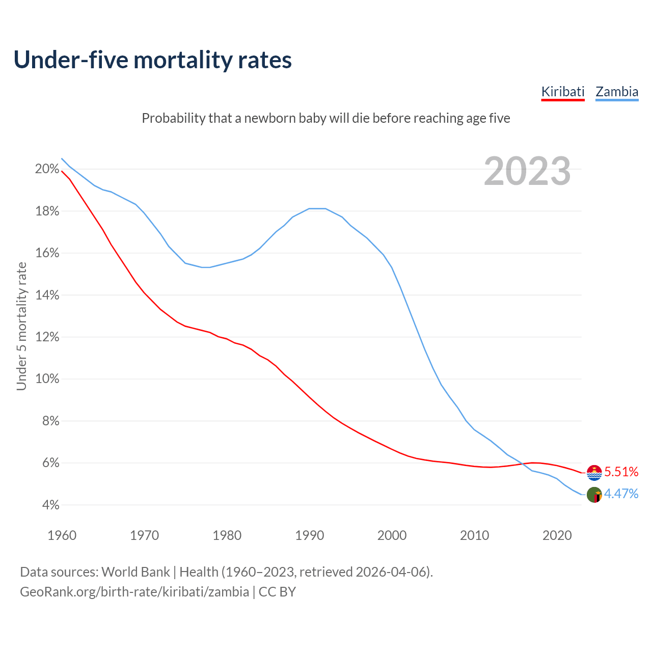 The chance that a newborn baby will die before reaching age five is 5.51% in Kiribati and 4.47% in Zambia. Above is a chart with historical data on under-five mortality rates.