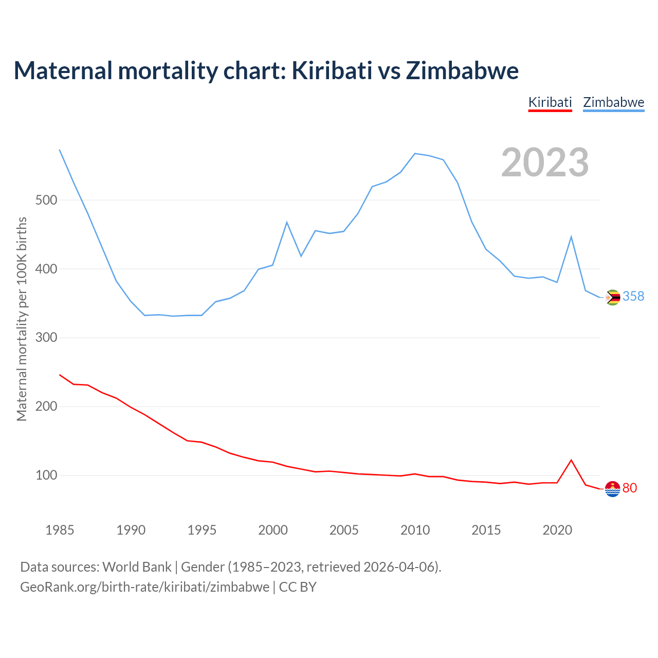 The maternal mortality rate, which is the probability of dying during childbirth or within 42 days of pregnancy termination, is 80 deaths per 100,000 live births in Kiribati, compared to 358 deaths in Zimbabwe.