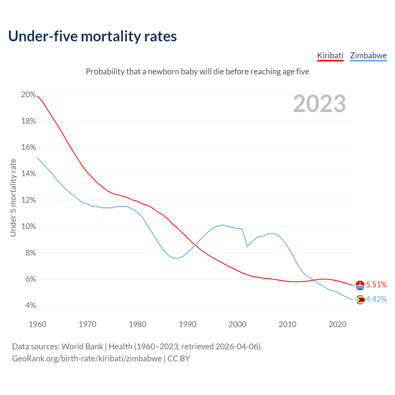 The chance that a newborn baby will die before reaching age five is 5.51% in Kiribati and 4.42% in Zimbabwe. Above is a chart with historical data on under-five mortality rates.