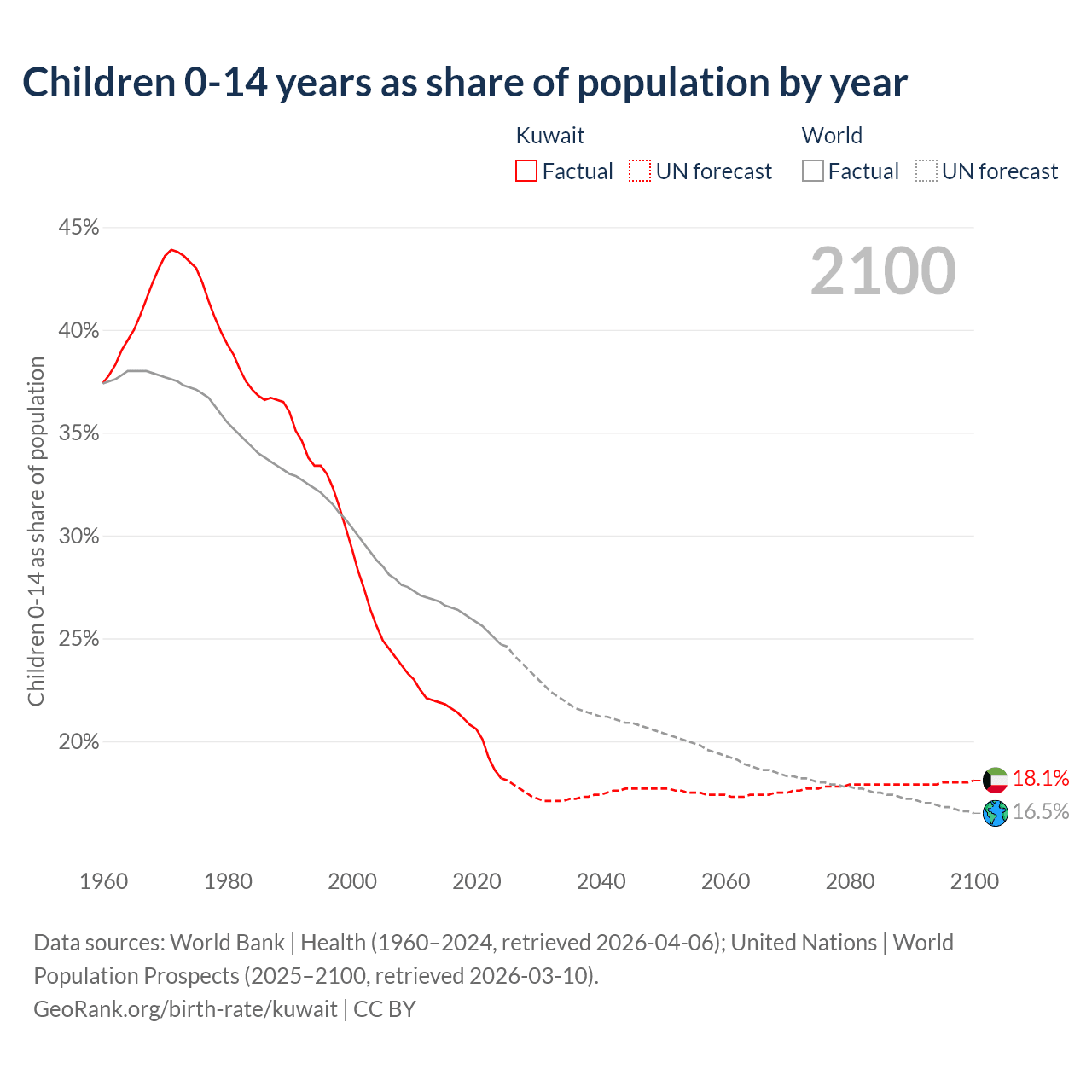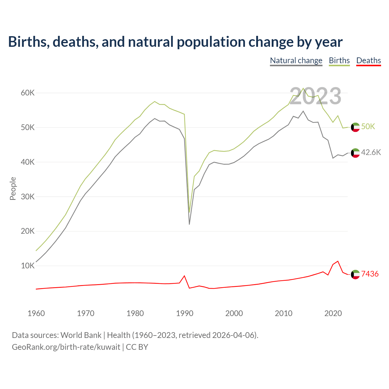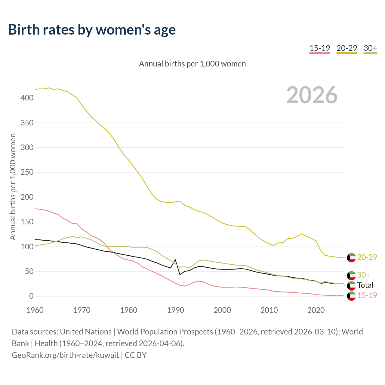 According to the latest birth rate data available, the fertility rate in Kuwait was 1.52 in 2023 and has been below the replacement level of 2.1 children per woman since 2022. In 1993, the fertility rate was 3.31 — a 54% decline in 30 years.