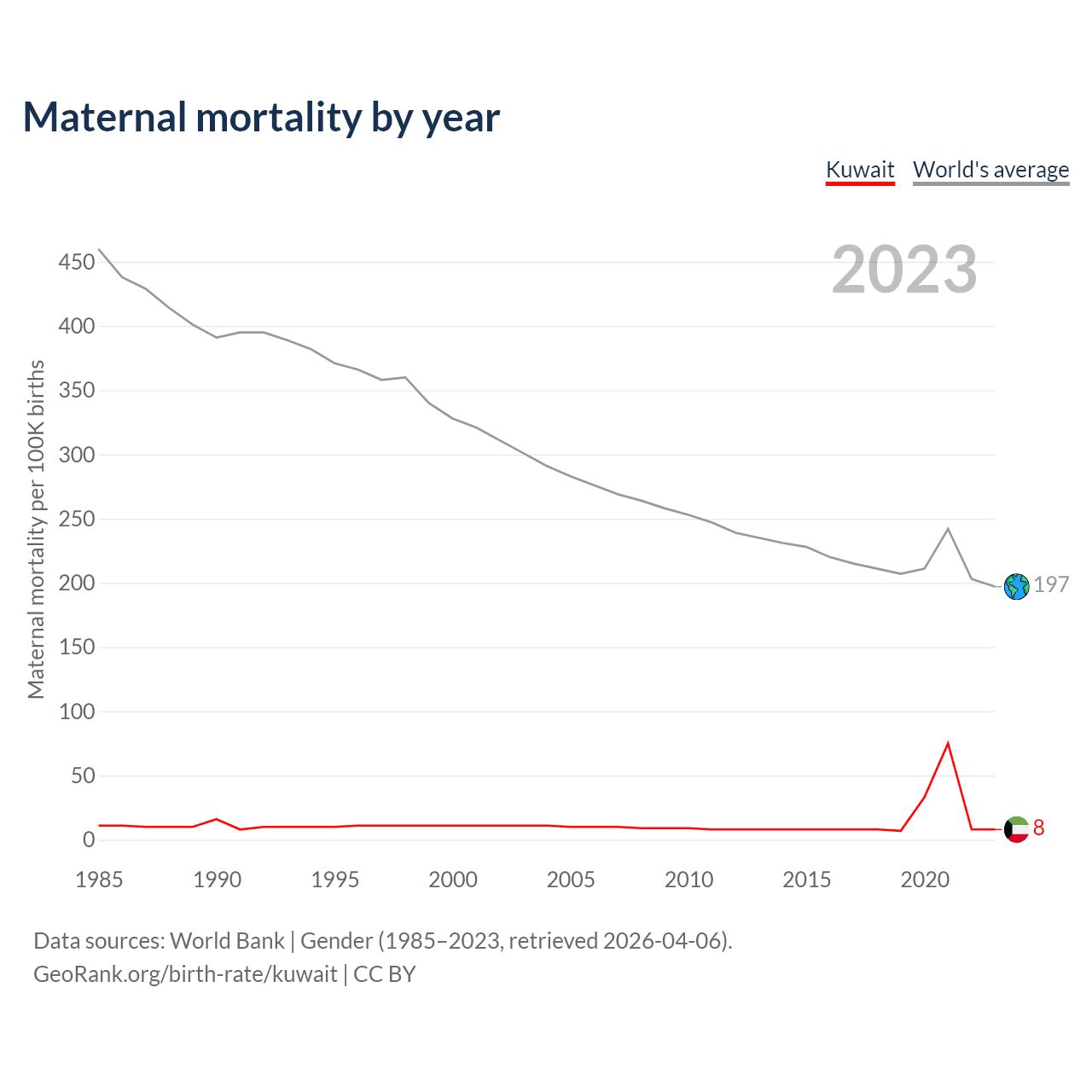 The maternal mortality rate in Kuwait was 8 deaths per 100,000 live births in 2023 — a 0.008% chance of dying during childbirth or within 42 days of pregnancy termination. This is a 27.3% decrease compared to the year 2000.