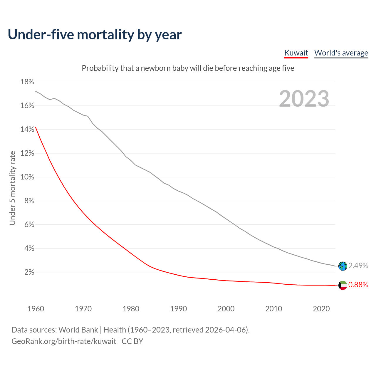 The under-5 mortality rate in Kuwait was 8.8 deaths per 1,000 live births in 2023 — a 0.88% chance that a newborn baby will die before reaching age five. This is down from 12.7 deaths per 1,000 live births in 2000.