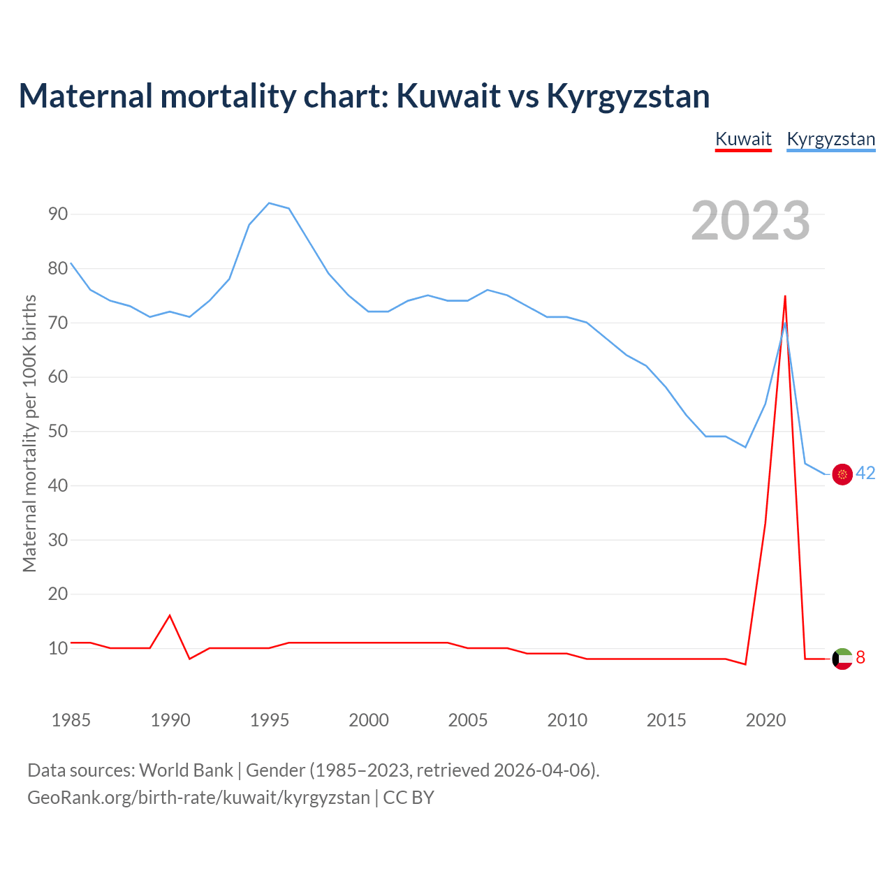 The maternal mortality rate, which is the probability of dying during childbirth or within 42 days of pregnancy termination, is 8 deaths per 100,000 live births in Kuwait, compared to 42 deaths in Kyrgyzstan.