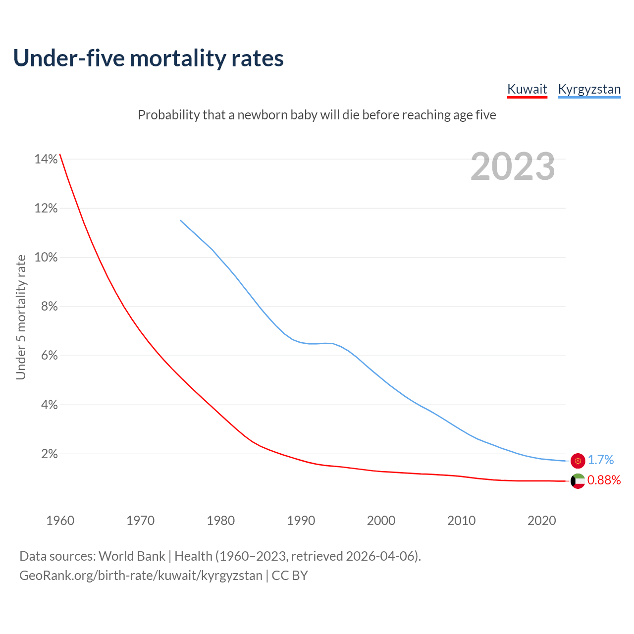 The chance that a newborn baby will die before reaching age five is 0.88% in Kuwait and 1.7% in Kyrgyzstan. Above is a chart with historical data on under-five mortality rates.