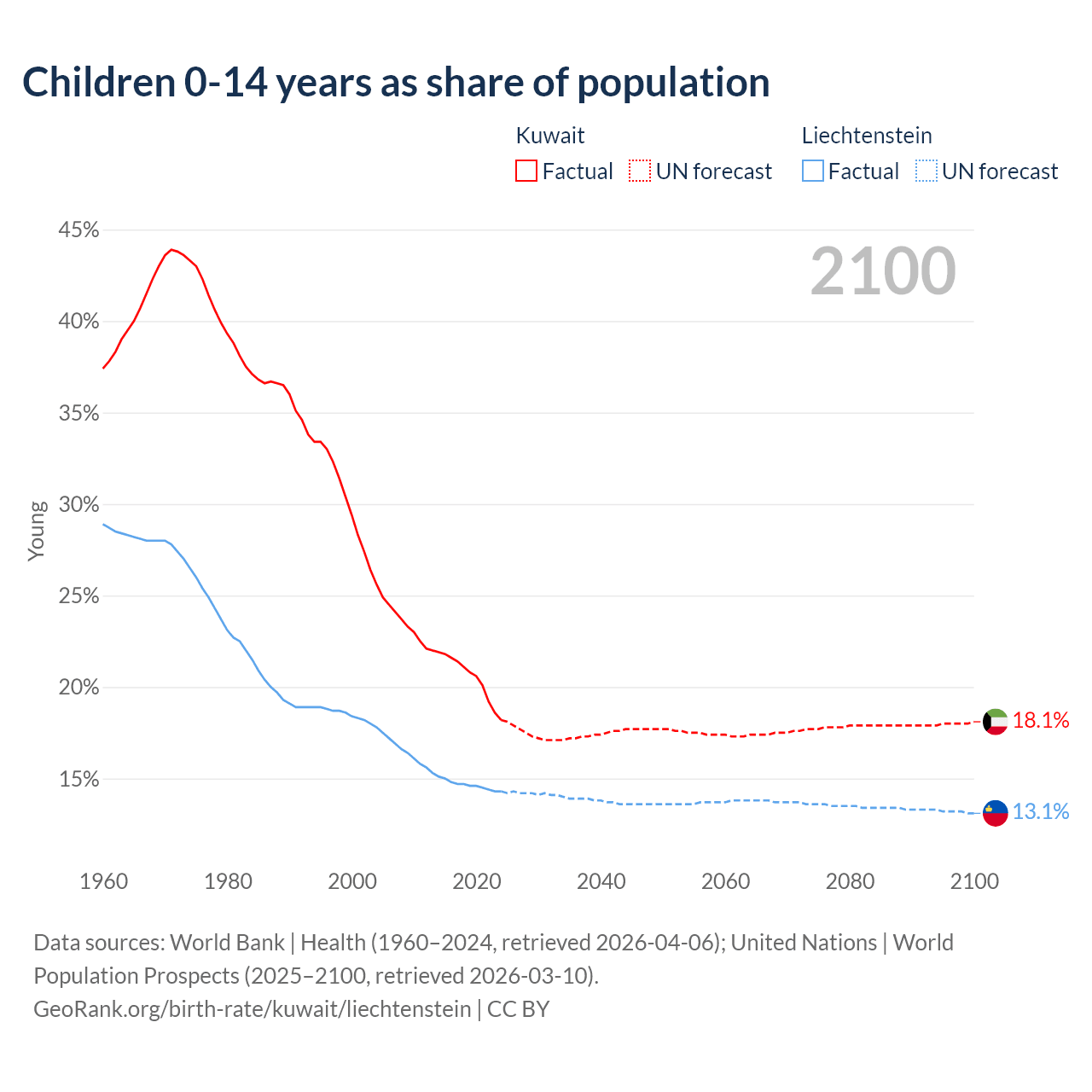 Children aged 0-14 make up 18.2% of the population in Kuwait and 14.3% in Liechtenstein in 2024, compared to 36% and 19.1% respectively in 1990.