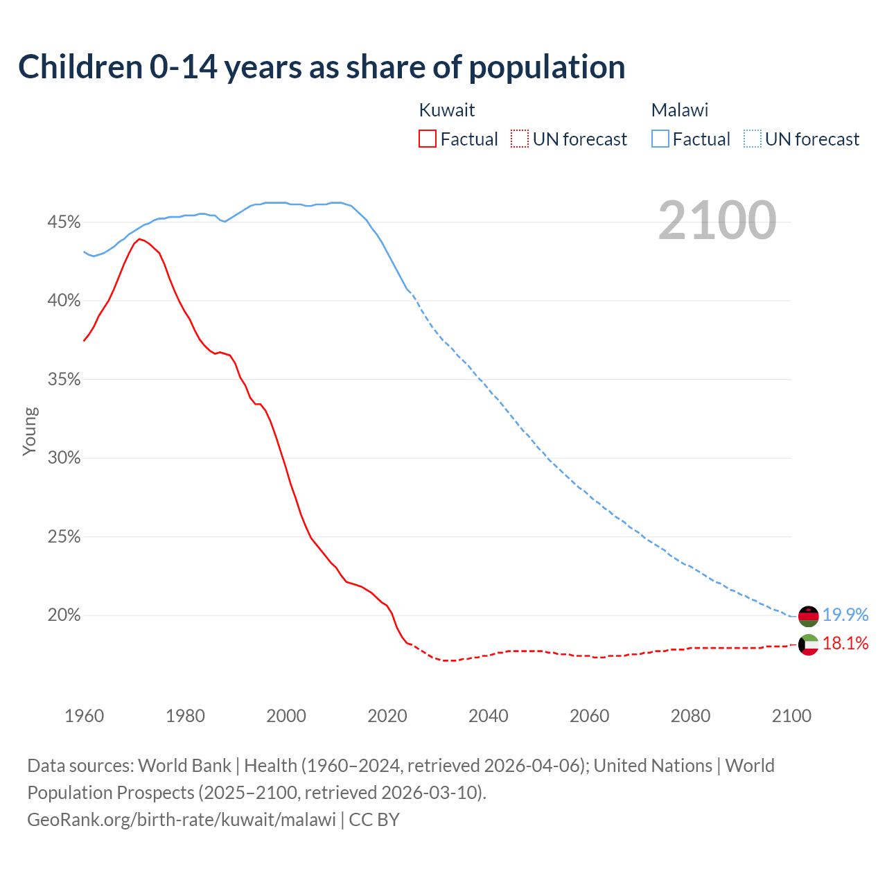 Kuwait has an annual birth rate of 10.3 births per 1,000 people, compared to 31.4 for Malawi. The average number of children a woman is expected to have during her lifetime — the fertility rate, is 1.52 in Kuwait and 3.65 in Malawi — 139.4% difference.