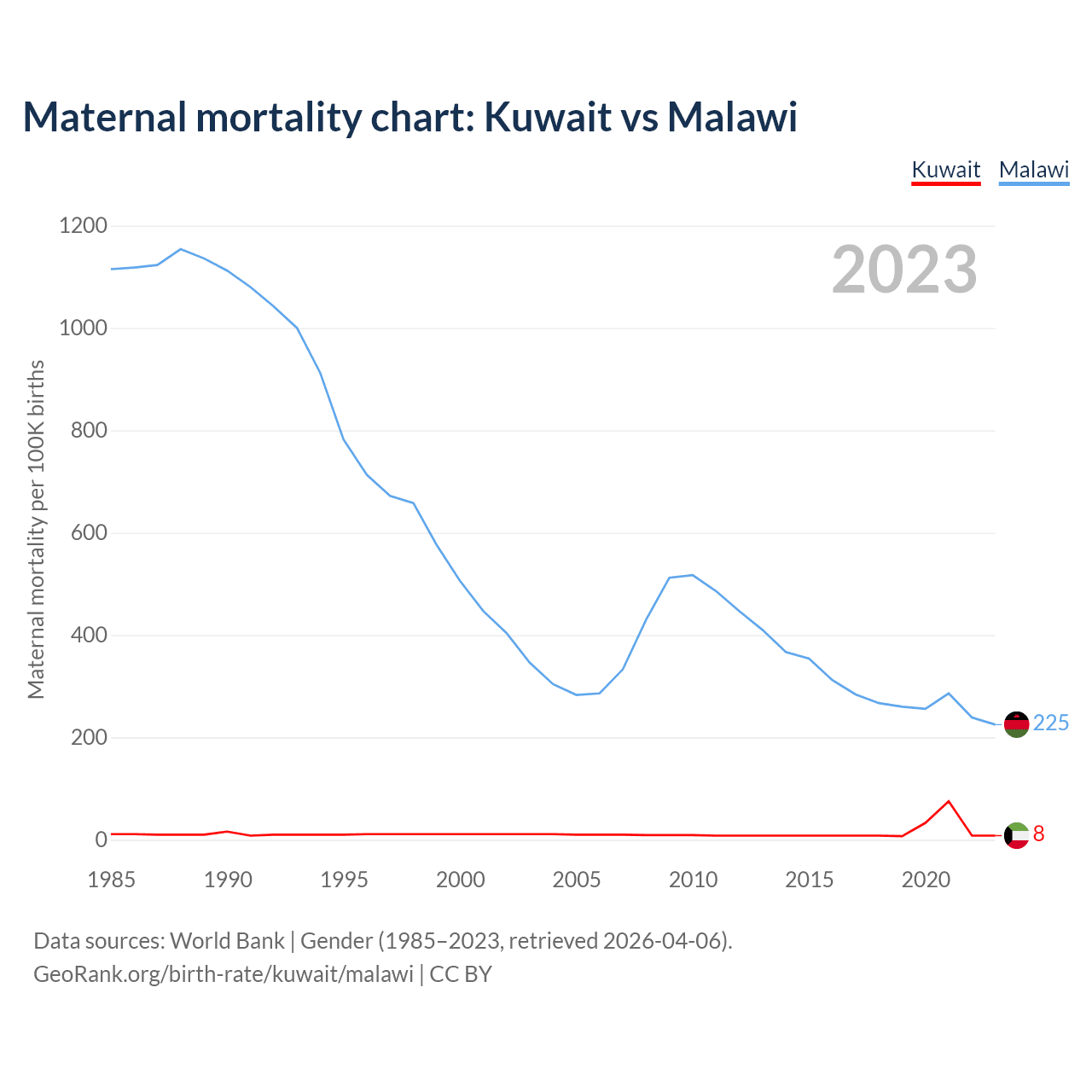 The maternal mortality rate, which is the probability of dying during childbirth or within 42 days of pregnancy termination, is 8 deaths per 100,000 live births in Kuwait, compared to 225 deaths in Malawi.