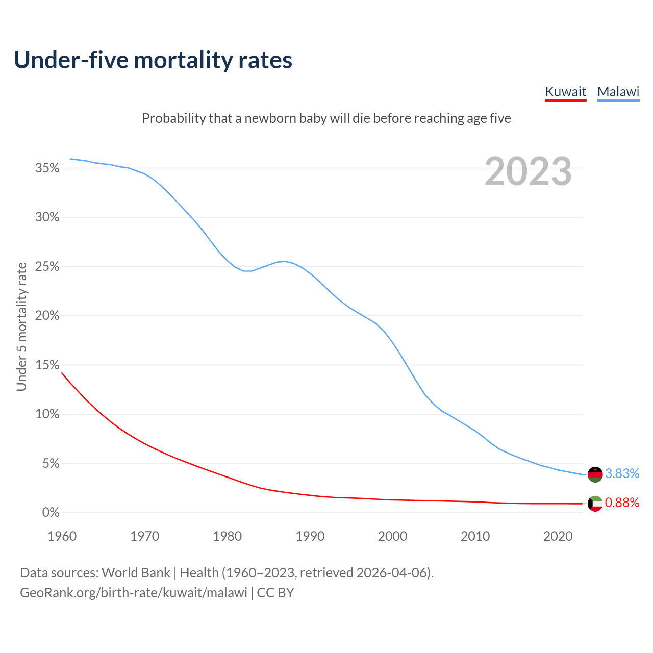 The chance that a newborn baby will die before reaching age five is 0.88% in Kuwait and 3.83% in Malawi. Above is a chart with historical data on under-five mortality rates.