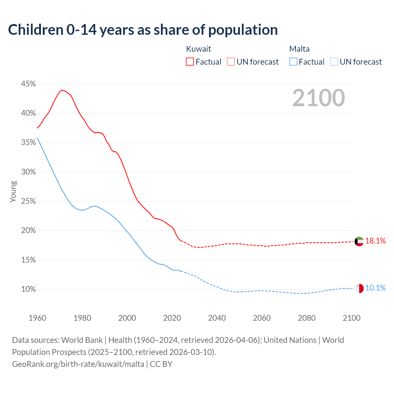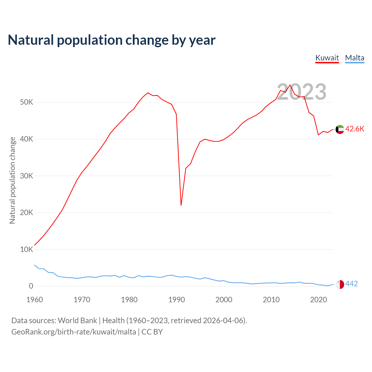 According to the latest available data on birth rates, the fertility rate in Kuwait was 1.52 children per woman in 2023, compared to 1.06 in Malta in 2023. The replacement level is considered to be 2.1 children per woman.