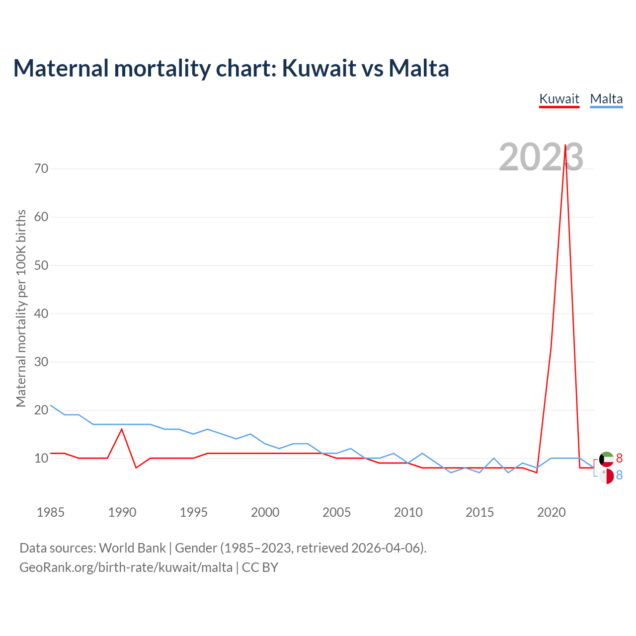 The maternal mortality rate, which is the probability of dying during childbirth or within 42 days of pregnancy termination, is 8 deaths per 100,000 live births in Kuwait, compared to 8 deaths in Malta.
