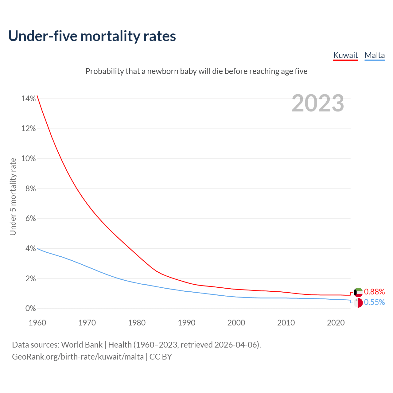 The chance that a newborn baby will die before reaching age five is 0.88% in Kuwait and 0.55% in Malta. Above is a chart with historical data on under-five mortality rates.