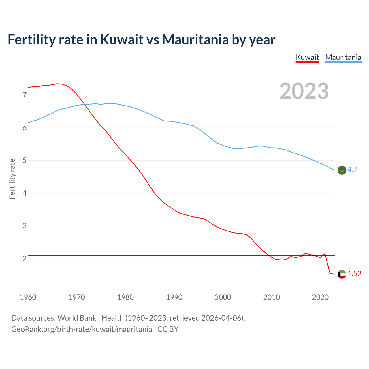 According to the latest available data on birth rates, the fertility rate in Kuwait was 1.52 children per woman in 2023, compared to 4.7 in Mauritania in 2023. The replacement level is considered to be 2.1 children per woman.